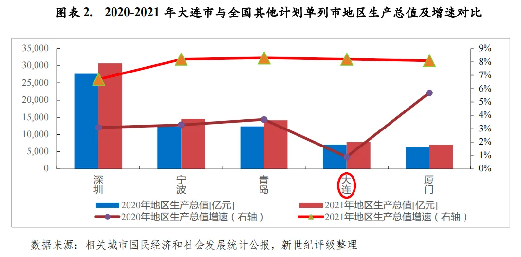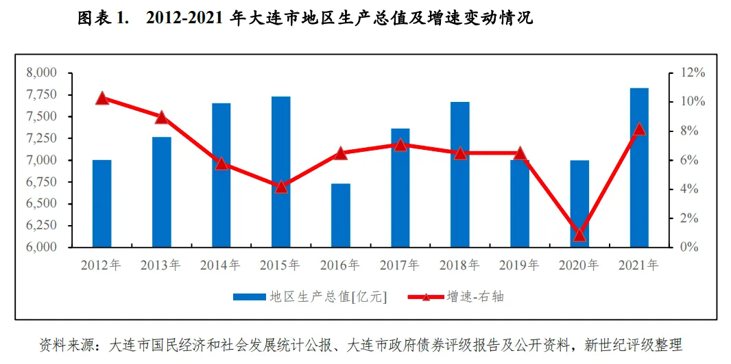 大连市处于东北亚地理中心,区位优势明显,是我国东北地区重要的港口及工业城市,全市石化、装备制造等工业基础较好。2021年,受益于疫情较好防控及国际原油价格高位运行带动工业较快增长,大连市经济增速较高,但投资和消费增长乏力。2022年前三季度,受复杂严峻的国内外形势和多重超预期因素冲击,大连市经济较低速增长,投资和出口增长,但消费下降,大连市经济增长仍持续承压。大连市位于我国辽东半岛南端,是我国5个计划单列市之一,全市土地面积1.26万平方公里,海域总面积为8355.8平方公里,海岸线总长为1594.4公里。截至2021年末,大连市常住人口754万人,较2020年末增加9万人,在辽宁省人口排名第二,仅次于沈阳市。大连市处于东北亚地理中心,区位优势明显,是我国东北地区唯一的不冻港及最大的港口,全市石化、装备制造等工业基础较好。2021年,受益于对疫情的较好防控及国际原油价格高位运行带动工业较快增长,大连市经济恢复较快,地区生产总值实现7825.9亿元,在全国5个计划单列市中排名第4位,排名与上年持平,仅高于厦门市;同年,大连市地区生产总值增速为8.2%,增速高于全国水平0.1个百分点,高于辽宁全省水平2.4个百分点,在5个计划单列市中与宁波市并列第二位;人均地区生产总值为10.38万元,为全国水平的1.28倍。大连市是重要的港口、贸易、工业和旅游城市,工业及服务业较发达,第二、三产业对经济贡献大。2021年,大连市第一、第二和第三产业增加值分别为513.3亿元、3301.6亿元和4011.0亿元,同比分别增长5.8%、9.4%和7.5%,三次产业结构为6.6:42.2:51.2,得益于第二产业较快增长,第二产业占比较上年提升2.0个百分点。2022年前三季度,大连市实现地区生产总值6191.3亿元,在5个计划单列市中仍排名第4位,同比增长3.9%,增速高于5个计划单列市中的深圳市和宁波市,排名第3位。大连港是深水天然良港,是我国南北水陆交通的重要枢纽,是东北地区进入太平洋、面向世界的门户。大连港是东北亚油品转运中心,是亚洲最先进的散装液体化工产品转运基地,是中国最大的海上客/车滚装运输港口。但受腹地转移,国内生产总值疲软,冷藏船出货量下降以及货运量转移到附近的营口等因素影响,近年来大连港货运量持续下降。2021年大连市沿海港口货物吞吐量3.2亿吨,较上年下降5.5%,货物吞吐量居全国港口第13位,较上年排名下降4位;集装箱吞吐量367.2万标箱,较上年下降28.1%,居全国港口第15位,较上年排名下降6位。近年来,大连市工业结构逐步优化,传统产业加快转型升级的同时,智能装备、新能源和新材料等战略性新兴产业较快发展。目前,全市已形成19个省重点产业集群[1],其中大连湾临海装备、金普新区电子信息、高新区软件和信息技术服务、瓦房店轴承以及金普新区智能装备五个集群先后被确定为国家新型工业化产业示范基地。2021年,大连市工业经济较快增长,全市规上工业实现总产值8245.2亿元,同比增长19.9%,增速比上年加快23.1个百分点;规模以上工业增加值同比增长15.0%,增速比上年加快11.2个百分点,两年平均增速9.3%。从重点行业看,2021年,在国际原油价格高位运行的带动下,占比33.1%的石化工业增加值同比增长16.4%,增速比上年加快4.0个百分点;上拉规上工业5.4个百分点,拉动点比上年提高1.2个百分点,石化工业支撑作用稳固;占比44.6%的装备制造业同比增长7.1%,增速比上年加快4.4个百分点,但分别比一季度、上半年和前三季度回落25.7个、10.3个和3.4个百分点,主要系受大宗商品价格上涨、关键原材料短缺及部分产品订单量下滑等不利因素影响,规上装备制造业企业持续减产,增加值增速呈逐步回落态势。其中,汽车制造业同比下降10.1%,降幅比上年扩大14.0个百分点,下拉全市规上工业1.1个百分点;通用设备制造业,计算机、通信和其他电子设备制造业,铁路、船舶、航空航天和其他运输设备制造业分别同比增长17.0%、4.8%和2.1%,快于上年9.0个、8.5个和3.9个百分点。从高技术制造业看,2021年大连市高技术制造业加速回暖。当年全市规上高技术制造业增加值同比增长18.9%,增速比2020年加快23.2个百分点;占全市规上工业比重11.1%;上拉规上工业2.1个百分点。分行业看,医药制造业,航空、航天器及设备制造业,医疗仪器设备及仪器仪表制造业,计算机及办公设备制造业分别同比增长64.4%、31.5%、18.5%和16.4%;分产品看,锂离子电池、电子元件、工业仪表等产品产量分别增长116.6%、20.3%和10.6%。2022年前三季度,大连市规模以上工业增加值同比增长4.9%,增速较上年同期下降11.2个百分点。分三大门类看,采矿业增加值同比下降34.0%;制造业同比增长5.3%;电力、热力、燃气及水生产和供应业同比增长0.8%。同期,占比11.3%的高技术制造业增加值同比增长15.1%,增速高于全市规上工业10.2个百分点;上拉全市规上工业增加值1.7个百分点。分行业看,占高技术制造业增加值比重28.9%的医药制造业增长35.4%;占比57.1%的电子及通信设备制造业增长14.9%。分产品看,工业仪表、锂离子电池、集成电路圆片产量分别同比增长65.5%、31.1%和8.0%。服务业方面,大连市现代服务业发展较快,服务业结构呈现优化态势。除传统的交通运输、旅游业及金融业外,互联网信息技术与传统产业融合加快,战略性新兴服务业、高技术服务业、现代新兴服务业[2]等新产业较快发展。2021年,大连市第三产业增加值实现4011.0亿元,同比增长7.5%。全