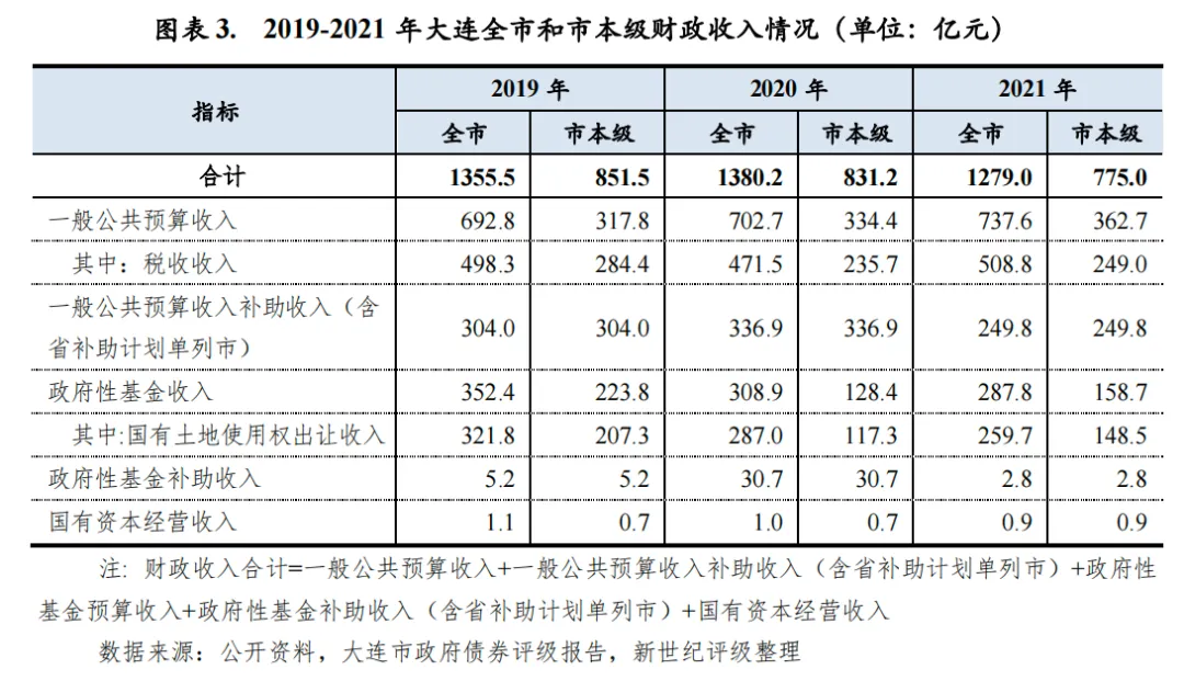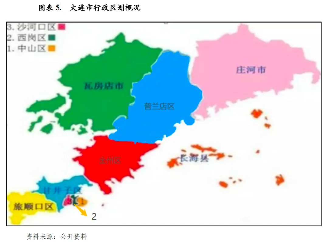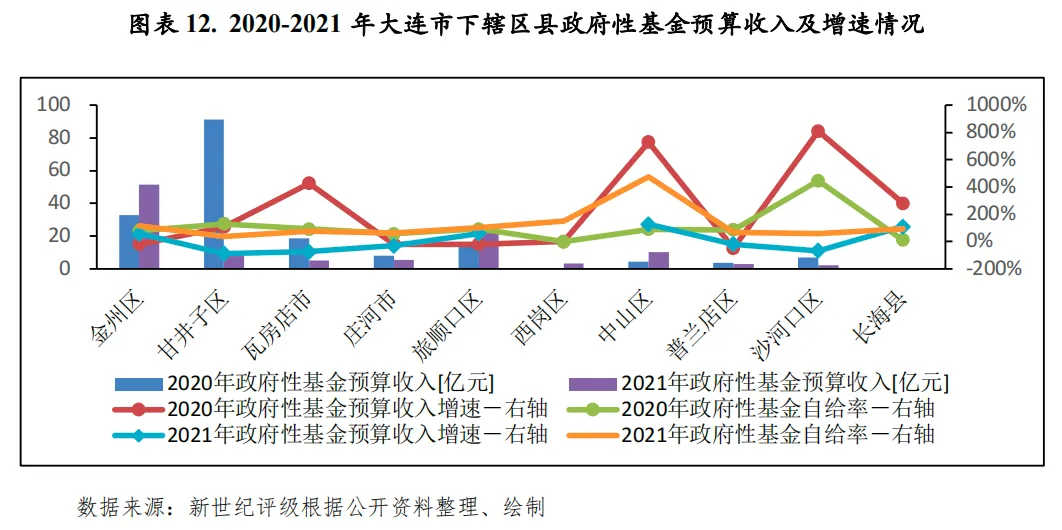 大连市政府性基金收入主要来源于国有土地使用权出让收入,近三年收入规模持续下降。2021年主要受大连市土地供应不足,且房地产市场走低影响,大连市国有土地使用权出让收入同比下降9.5%至259.7亿元,政府性基金收入同比下降6.8%至287.8亿元。同年全市政府性基金预算支出292.6亿元,同比大幅下降21.4%,其中城乡社区支出达209.0亿元,同比减少21.6%,占政府性基金预算支出71.4%。从市本级情况看,2021年政府性基金收入为158.7亿元;同年市本级政府性基金预算支出136.2亿元。2021年,大连市全市政府性基金预算自给率为98.4%,全市政府性基金预算收入基本能够覆盖支出;市本级政府性基金预算自给率为116.6%,市本级政府性基金预算收入能够覆盖支出。2022年前三季度,大连市政府性基金收入111.3亿元,受房地产政策调控、市场低迷影响,同比明显下降50.4%,其中土地出让收入98亿元,同比下降52.5%;全市政府性基金支出完成275.9亿元,同比增长45.7%,其中其他政府性基金及对应专项债务收入安排的支出110.4亿元,同比增长345.4%。同期,市本级政府性基金收入完成20.5亿元,同比下降85.9%,其中,市本级土地出让收入13.8亿元,同比下降89.8%;市本级完成政府性基金支出132.4亿元,同比增长56.1%,其中,市本级其他政府性基金及对应专项债务收入安排的支出74.10亿元。2022年前三季度,大连市全市政府性基金预算自给率为40.3%,较上年同期大幅下降78.3个百分点;市本级政府性基金预算自给率为15.5%,较上年同期大幅下降156.2个百分点,全市及市本级政府性基金预算收入对支出覆盖程度均低。大连市下辖7个市辖区、2个县级市和1个县,中山区、西岗区、沙河口区、甘井子区、旅顺口区、金州区和普兰店区为市辖区,瓦房店市和庄河市为县级市,还有长海县,其中瓦房店市和庄河市是全国百强县,在“2022年赛迪综合实力百强县排名”中,瓦房店市名列第61位,较上年提升2位,列东北地区县域经济首位;庄河市列第99位,排名较上年下降5位。根据十四五规划和二〇三五年远景目标纲要,大连市正加快构建“5+4+3+1”融合发展的现代产业体系。其中“5”是指制造业中的绿色石化、高端装备制造、新一代信息技术、新一代汽车、中高端消费品工业五大主导产业,“4”是指服务业中的现代金融、物流、贸易、文旅四大主导产业,“3”是指战略性新兴产业中的生命安全、洁净能源、新材料三大主导产业,“1”是指都市现代农业。产业空间布局上,大连市围绕黄海和渤海沿岸打造“两岸三湾多园区”的产业空间格局。黄海沿岸重点发展新能源、新材料、海洋经济、纺织服装、食品加工、旅游休闲等特色产业,渤海沿岸重点发展绿色石化、高端轴承、电力装备等先进制造业,增强黄海渤海两岸协同能力。围绕大连湾建设国际活力湾区、金州湾打造东北亚空港商务区、太平湾构建东北亚“新蛇口”的功能定位,强化“三湾”示范引领功能,带动其他湾区“一湾一策”联动发展,推动浪漫海湾名城建设。大连市产业资源、人口等主要集聚于区域面积较大的区县,各区县经济发展水平差异明显。以制造业等为主导的金州区及甘井子区第二产业较发达,2021年区域经济总量居前两位,其中金州区超2500亿元,显著领先于其他各区县;以金融业、商业等服务业为主的中山区经济总量排名第三,地区生产总值超850亿元;以农渔业为主导的长海县现阶段经济发展水平显著落后于其它区县,经济体量小,地区生产总值不足百亿元。增速方面,2021年大连市下辖各区县均实现增长,增速均在6.0%以上。从需求端看,2021年大连市各区县(剔除未获得公开数据的旅顺口区)固定资产投资规模差别较大,金州区排名居各区县首位,长海县规模最小,除沙河口区和长海县负增长外,其余各区县均实现正增长,但增速差异较大,庄河市增速最高达29.4%。2021年,大连市各区县社会消费品零售总额均为正增长,但除庄河市外其余区县增速相对较低。2022年上半年度,可获得公开数据的6个区县地区生产总值均实现正增长,但增速均在6.0%及以下。根据大连市产业布局,以制造业等为主导的金州区及甘井子区工业较发达,区域经济总量领先;以金融业、商业等服务业为主的中山区经济总量亦排名前列;以农渔业为主的长海县现阶段经济水平显著落后于其它区县,经济体量小。从经济总量看,2021年大连经济技术开发区和保税区所在的金州区人口及工业资源集聚,汇集了众多国内外大型企业入驻,以汽车、电子、装备制造等经济产业为主导,地区生产总值达2529.00亿元,已连续多年居大连各区县首位;甘井子区人口及工业资源亦较集中,地区生产总值955.96亿元,居次席;大连市的商业及金融中心中山区实现地区生产总值855.28亿元,排名第三位;以生产轴承著名的瓦房店市实现地区生产总值643.70亿元,排名第四位;庄河市、沙河口区和西岗区地区生产总值均在500-600亿元,普兰店区、旅顺口区和长海县地区生产总值在400亿元以下,其中以农渔业为主的长海县地区生产总值为93.80亿元,在各区县垫底。从经济增速看,随着疫情得到有效防控、经济逐步恢复,2021年大连市下辖各区县均实现增长,增速均在6.0%及以上。其中6个区县经济增速超全国(8.1%)平均水平,甘井子区和金州区地区生产总值增长最快,增速分别达9.1%和9.0%;庄河市、瓦房店市、旅顺口区和长海县增速分别为8.5%、8.3%、8.3%和8.2%;其余4个区县增速低于全