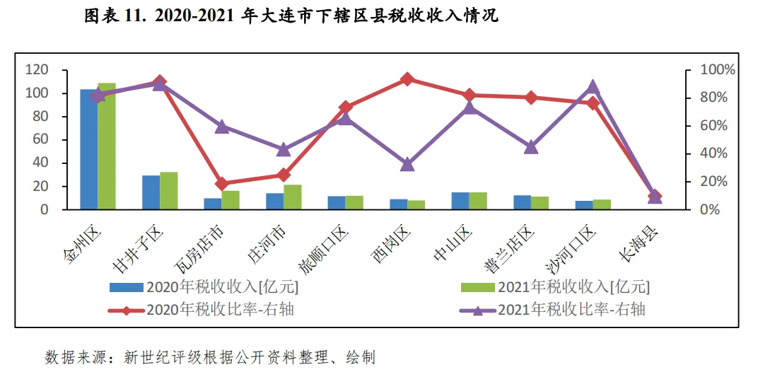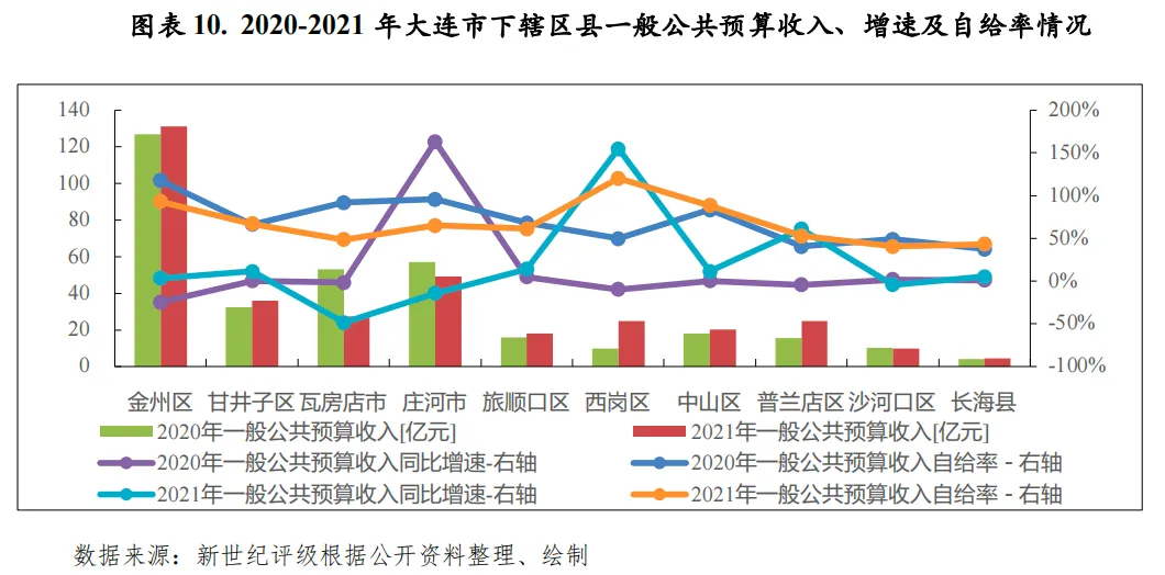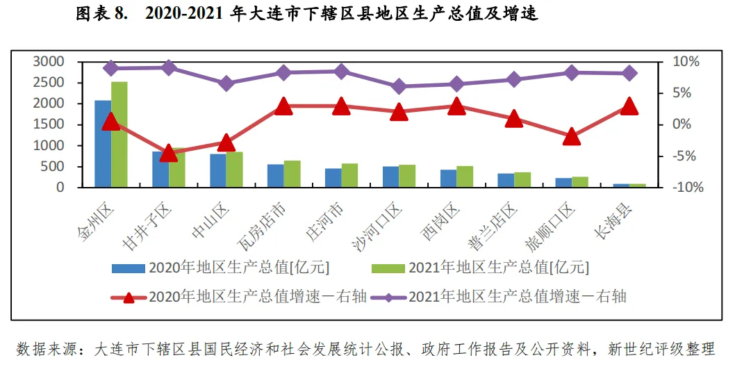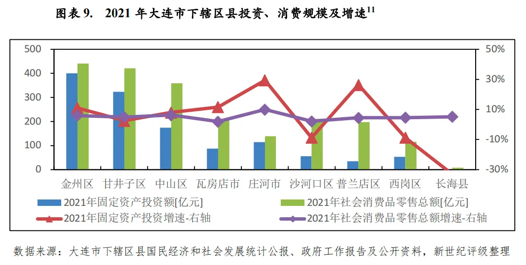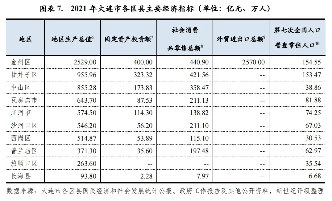 [8]2021年,瓦房店市和普兰店区社会消费品零售总额数据根据上年数据和当年增速由新世纪评级计算得出,旅顺口区社会消费品零售总额数据未获得。