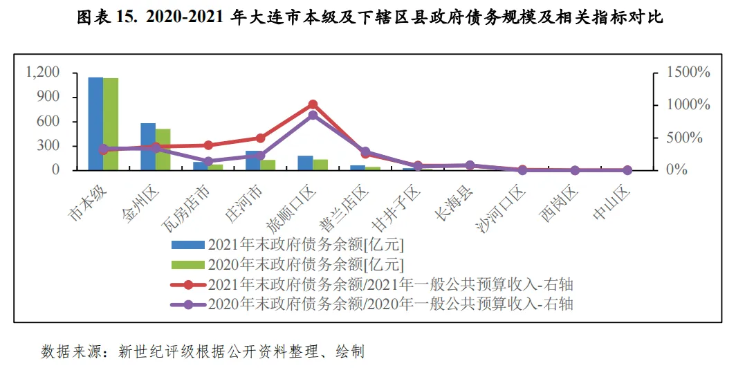 2021年大连市下辖区县政府性基金收入增减各半,但大部分区县政府性基金收入规模较小,对当地财力的贡献有限;金州区及旅顺口区系当年土地成交主场地,政府性基金收入规模明显大于其他各区县;大部分区县政府性基金收入自给率变化大,超半数区县收入未能覆盖支出。2021年,地产行业上下半年冷热分明,上半年土拍火热,下半年受调控政策和信贷环境收紧影响,市场迅速降温。当年,大连市土地成交面积和成交金额双降,从区域分布来看,大连市内各区土拍“边缘化”的程度进一步加剧,金州区及旅顺口区增幅相对较大。2021年,大连市下辖10个区县政府性基金收入增减各半,但大部分区县政府性基金收入对其财力贡献有限。从绝对规模看,2021年受益于大连土地出让以金州区为重要区域之一,当年金州区实现政府性基金收入51.59亿元,收入规模明显大于其他各区县,排名首位;旅顺口区亦是土地成交的另一重要区域,当年实现政府性基金收入23.18亿元,排名次席;甘井子区和中山区则分别以10.77亿元和10.49亿元居第三、四位;其余区县均未超过10亿元,其中长海县政府性基金收入仅为0.40亿元,居末位。从相对规模看,以2021年政府性基金收入与财力[13]的比率为参考指标,大连市各区县政府性基金预算收入占比相对较小,其中旅顺口区政府性基金收入对财力的贡献度最高,为47.11%,原因是当年土地出让收入较上年显著增加所致;中山区和金州区该比率分别为26.68%和24.67%,对财力的贡献度一般,分列二、三名;甘井子区该比率为17.38%,列第四位;其余各区县该比率均未超过10%,对财力的贡献度低;长海县该比率仅为3.48%,在大连市各区县排名垫底。从增速看,剔除西岗区因上年无政府性基金收入无法计算外,2021年中山区和长海县政府性基金收入增速分别为127.85%和110.53%,主要系上年基数低所致,增速排名居前两位;旅顺口区和金州区政府性基金收入增速分别为59.20%和56.76%,主要受益于土地成交额增长,增速排名第三、四位;其余5个区县政府性基金收入增速为负,增速在-15%到-90%之间,其中甘井子区政府性基金收入增速为-88.18%,主要系上年土地成交额规模较大,基数较高所致,增速排名垫后。从政府性基金自给率情况看,2021年大连市下辖区县政府性基金自给率总体有所改善。其中,中山区政府性基金自给率为474.43%,排名居各区县首位;西岗区、金州区和旅顺口区政府性基金自给率分别为151.62%、114.42%和102.29%,以上4个区县政府性基金收入能够覆盖支出;其余各区县政府性基金自给率均在95%以下,其中长海县政府性基金自给率为94.56%,政府性基金预算收入基本能覆盖支出;甘井子区仅为37.46%,政府性基金预算收入对支出的覆盖程度低。大连市政府债务资金主要投向市政基础设施建设及土地储备,政府债务规模较大,政府债务余额与一般公共预算收入的比率较高,但政府债务期限偏长期,未来几年集中偿付压力较小。2021年大连市政府债券发行规模较上年大幅增长,2022年以来发行规模有所减少,政府债务规模控制在限额以内,政府债务风险尚可控。2021年,大连市共发行政府债券575亿元,较上年增加262亿元。按债券品种分,一般债券发行355亿元,专项债券发行220亿元。按募集资金分,新增债券发行86亿元,再融资债券发行489亿元。截至2021年末,大连市政府债务余额为2369.50亿元,较2020年末增加305.13亿元,较财政部核定的大连市2021年地方政府债务限额2554.14亿元少184.64亿元,其中,一般债务余额1512.25亿元,专项债务余额857.25亿元。从债务管理层级看,2021年末大连市政府债务市本级[14]、县(市、区)级债务余额分别占比48.49%和51.51%。从资金投向看,大连市大部分政府债务资金用于市政基础设施建设和土地储备。截至2021年末,用于市政基础设施建设和土地储备形成的政府性债务余额分别占同期末大连市政府性债务总额的比例为41.69%和12.73%。以地方政府债务余额与一般公共预算收入规模相对比,2021年末大连市地方政府债务余额是其当年一般公共预算收入的3.21倍,较上年有所上升,低于辽宁省3.89倍的水平,但处于中等偏下水平,列全国36个省(自治区、直辖市、计划单列市)按降序排列的第19位,排名较上年末上升2位。2022年前三季度,大连市共发行地方政府债券390亿元,较上年同期减少105亿元,按债券品种分,一般债券发行134亿元,专项债券发行256亿元;按募集资金分,新增债券发行180亿元,再融资债券发行210亿元。截至2022年9月末,大连市政府债券余额为2528.92亿元。根据《2022年辽宁省新增政府债务限额和省本级预算调整方案》,财政部下达辽宁省大连市2022年新增政府债务限额129亿元,其中一般债务限额20亿元,专项债务限额109亿元。大连市经济财政实力相对较强。大连市政府债务偿债资金主要来自一般公共预算收入、政府性基金收入和上级补助收入。从债务到期时间看,截至2021年末,大连市政府性债务2022-2026年到期的债务分别为291.80 亿元、317.83亿元、196.51亿元、303.99亿元和147.21亿元,占比分别为12.31%、13.41%、 8.29%、12.83%和6.21%,集中偿付压力较小。整体看,大连市债务规模在可控范围内,且多为建设型债务,期限结构偏长期,地区政府债务风险总体可控。大连市政府债务集中于市本级和主要的远郊区县,政府债务压力较大,长海县及市城区中心区域的四个区政府债务规模很小,债务偿付压力很小。大连市政府债务市本级[16]占比高,各区县政府