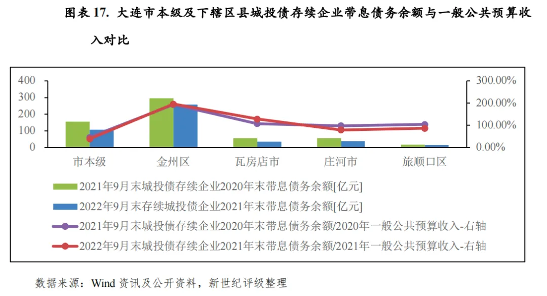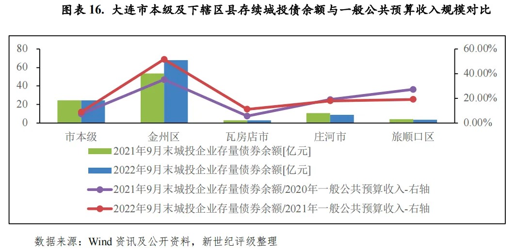 随着城投债逐渐到期偿付,但续发及新发规模不大,截至2022年9月末大连市各区县存量城投债券余额除金州区增长外,其余均与2021年同期末持平或减少。城投企业存量债券余额及带息债务主要集中在市本级及金州区,两地合计占比均超过大连市的80%。以2022年9月末存续城投债余额及城投企业2021年末带息债务余额与2021年一般公共预算收入规模相对比,金州区及瓦房店市城投企业带息债务偿付压力相对较重,各区县城投债偿付压力均较轻。