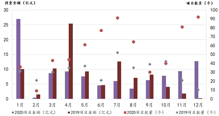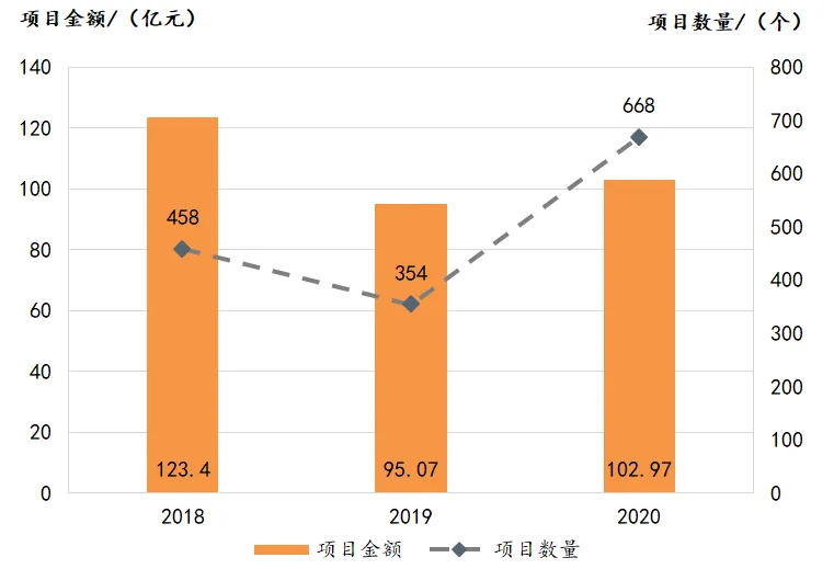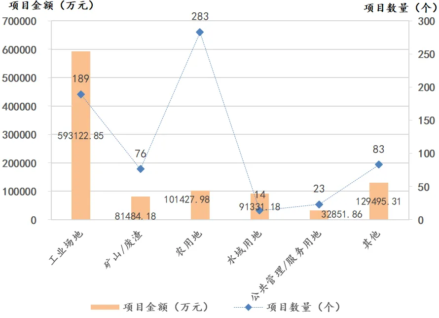 2020年四川、江西、山西等省农用地项目金额超过了工业场地项目金额,是该省份最主要的项目类型。