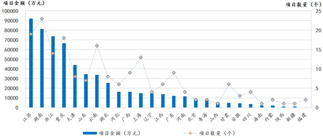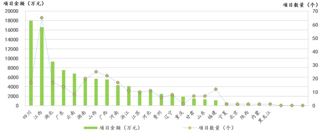 从项目数量来看,江西、湖南、广西、广东、山西、江苏、云南等7省启动的项目数量较多,均大于35个,江西以75个位列第一。