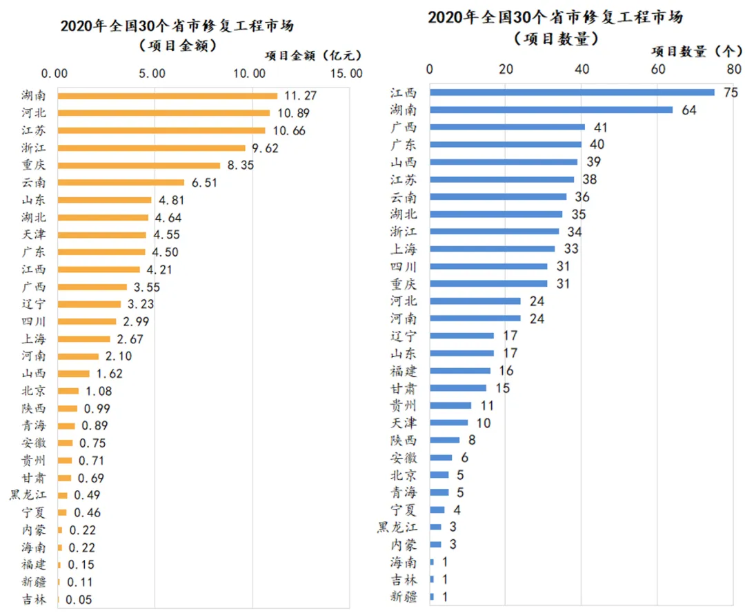 前一篇为2020年修复咨询服务篇,本篇为修复工程篇,将从市场总体状况、项目类型、空间分布、从业单位及典型工程项目等方面分别进行分析。