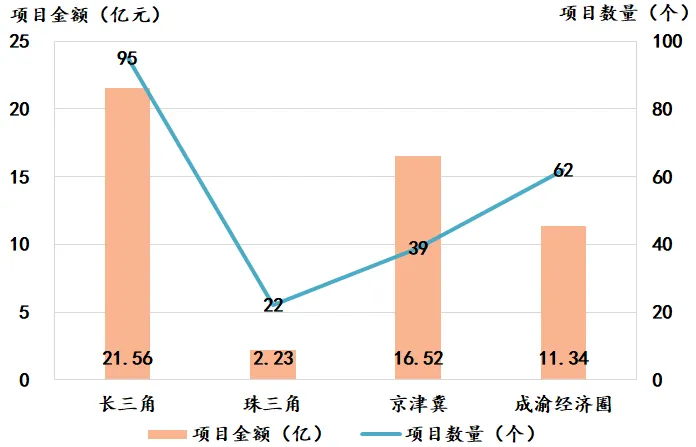 从项目数量来看,长三角、京津冀、成渝经济圈、珠三角重点区域修复工程项目总数量218个,占全国修复工程总项目数量的32.63%,其中长三角、成渝经济圈、京津冀、珠三角等区域修复工程项目数量分别是95个、62个、39个、22个,分别占全国工程总体项目数量的14.22%、9.28%、5.84%和3.29%。