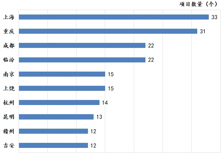 图9 2020年项目数量排列全国前10位的城市项目数量图