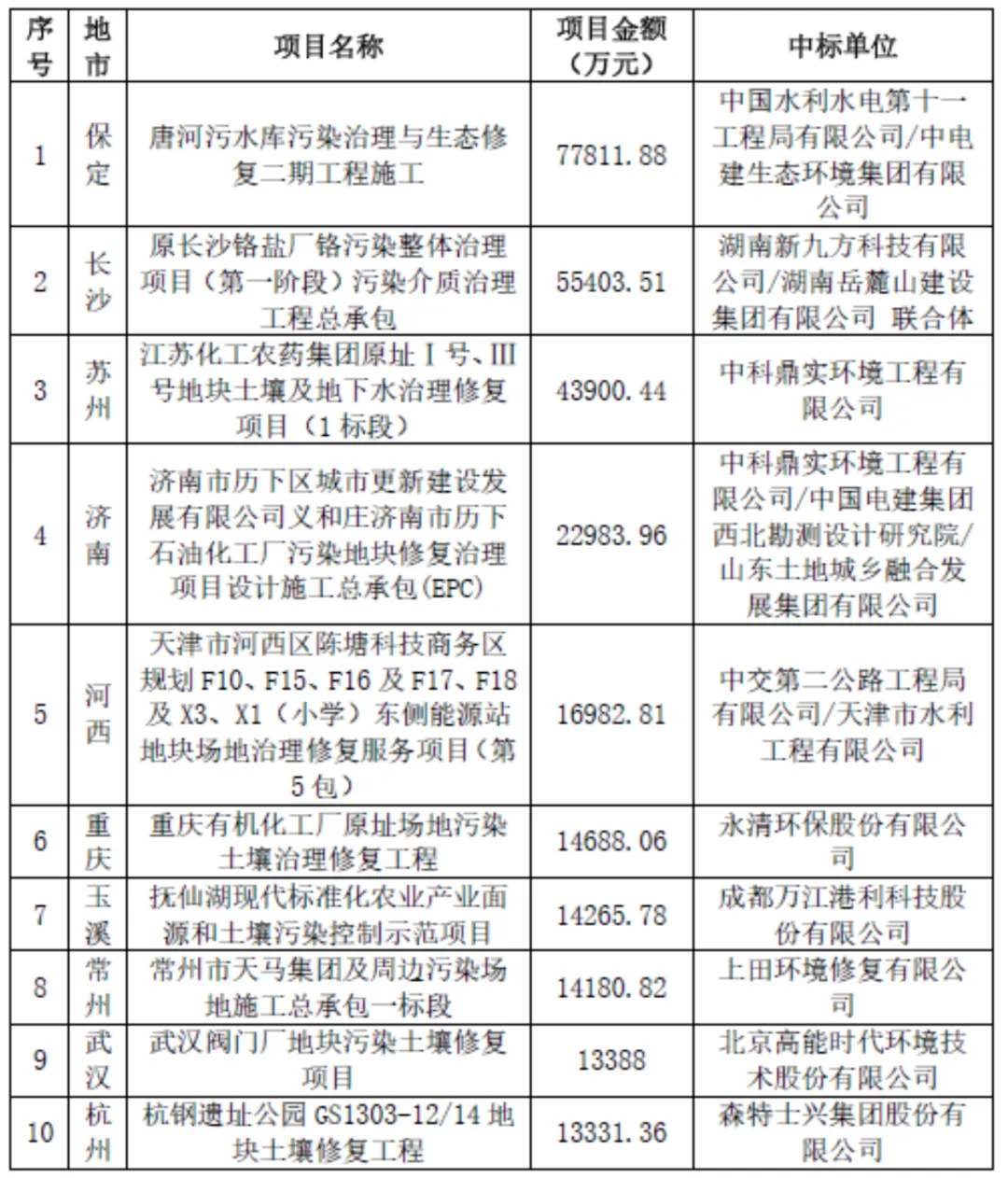 2020年工程项目金额较高的工程修复从业单位包括中科鼎实环境工程有限公司、中国水利水电第十一工程局有限公司与中电建生态环境集团有限公司联合体、北京高能时代环境技术股份有限公司、湖南新九方科技有限公司、中节能大地(杭州)环境修复有限公司、中冶南方都市环保工程技术股份有限公司、广西博世科环保科技股份有限公司、北京建工环境修复股份有限公司、江苏大地益源环境修复有限公司、森特士兴集团股份有限公司等。