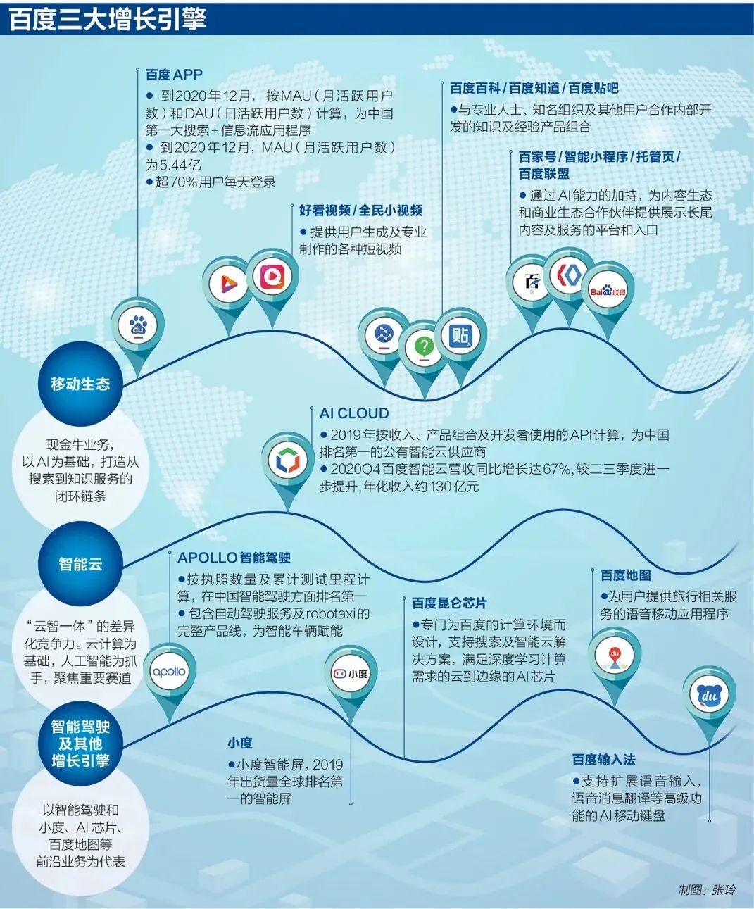招银国际研究部分析师白毅阳告诉作者,直到2020年上半年,市场还是主要关注百度核心(广告+爱奇艺)业务,尤其是对爱奇艺的亏损情况比较担心,因此股价长期处于低估。但是从2020年Q4开始,市场看到百度在AI及自动驾驶上有更多的动作,包括与吉利的合作、示范区数量的增长等等。因此,市场也逐步开始单独给其智能驾驶业务进行估值。看好百度未来在智能终端、芯片、云、算法等方面的生态打造,形成二次增长曲线,支撑其股价上的重估。