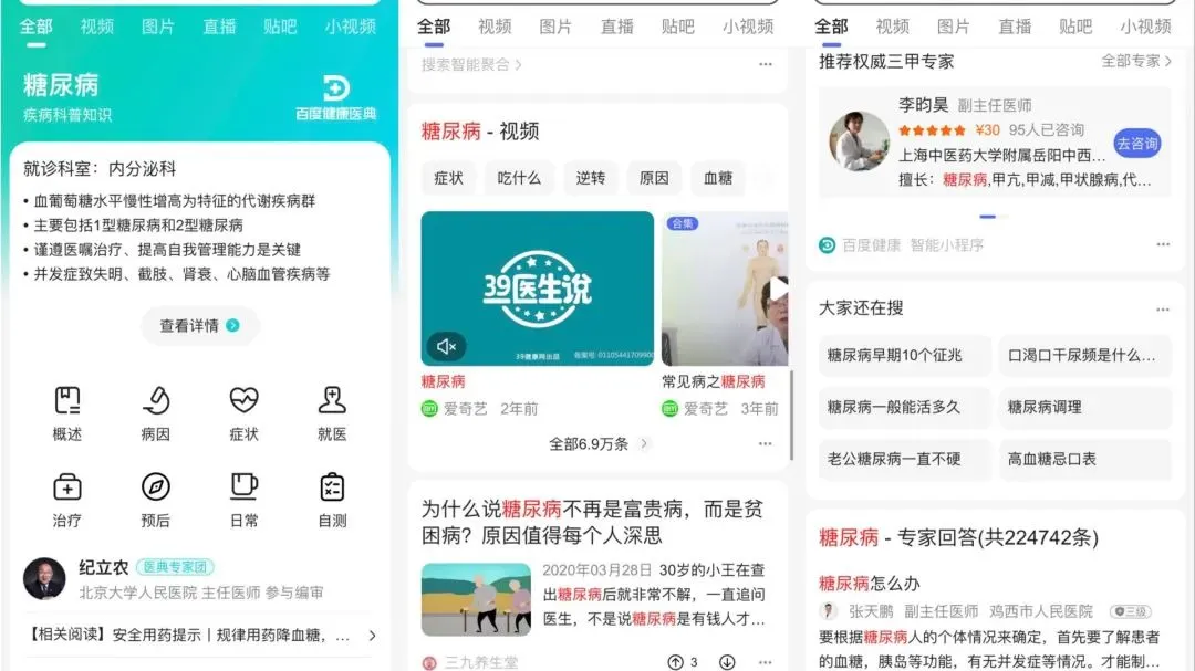 打开今天的百度App,搜索框仍然在最重要的位置上。当用户输入一个搜索词,比如“糖尿病”,最先显示的结果是糖尿病的科普知识,包括概述、病因、症状、就医、治疗、预后、日常和自测。