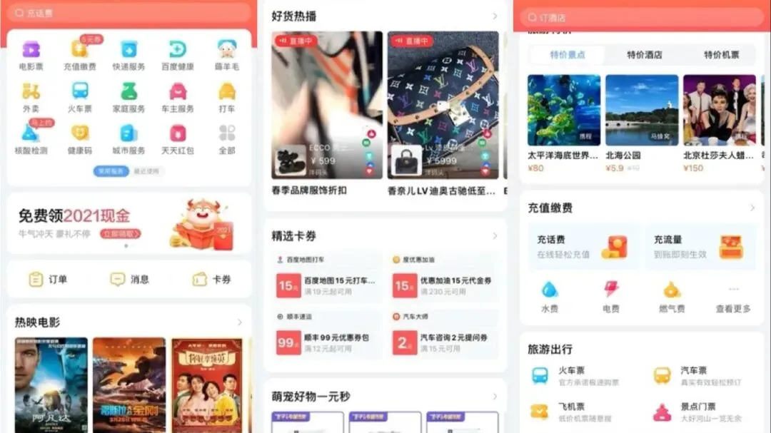 如果将首页往下拉,人们会看到一个二级服务大厅入口。服务大厅集合了百度移动生态上目前所有可以承载的服务内容,涵盖吃喝玩乐、城市服务、出行服务和日常必需服务。