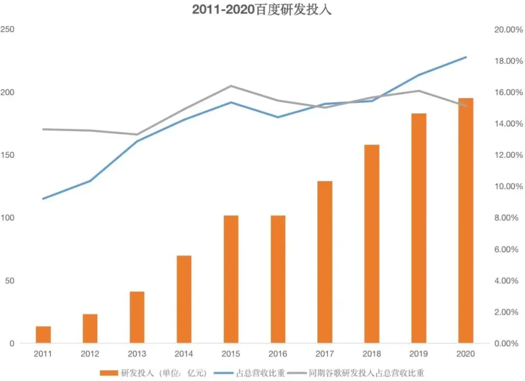 百度没有停止对AI的技术投入。根据历年财报公开数据,百度的技术研发投入从2015年开始大幅提升。2015年,百度的研发投入超过100亿元,占百度2015年总营收663.82亿元的15%。到了2020年,这个数字已经提升到了18%。