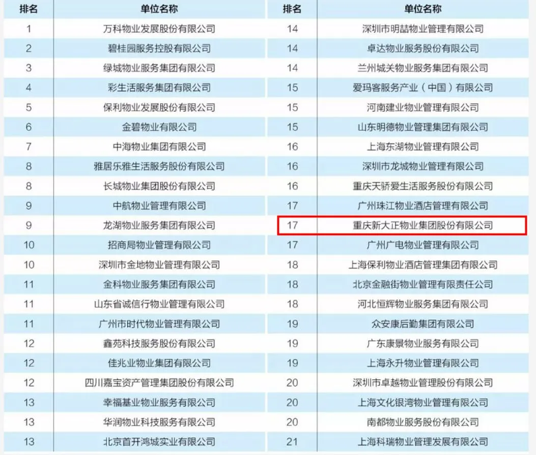 新大正物业成立于1998年,是重庆市最早成立的具有独立法人资格的专业物业管理公司之一。公司现有员工13000余人,管理300多个物业项目,管理服务面积约6000万平方米。企业综合实力位居重庆物业管理行业第3名、中国物业服务百强企业第17名,中国物业服务行业市场化运营领先企业第4名,是重庆市物业管理协会会长单位,中国物业管理协会常务理事单位,国家级服务业标准化试点单位。