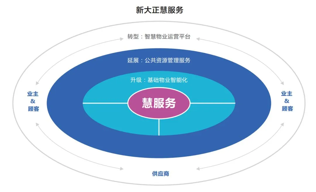 在现有体系和平台基础上,新大正用移动互联网和物联网的技术和思想,改造传统基础物业管理,延伸导入公共资源与资产管理,通过大数据衍生新业务。针对城市物业未来演变的趋势,新大正研究制定了未来在智慧物业场景下物业的运营模式——慧服务,完整设计新大正物业转型升级的路径。