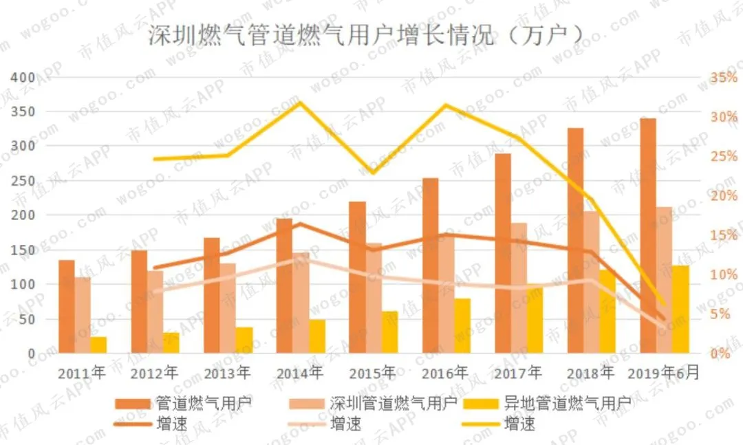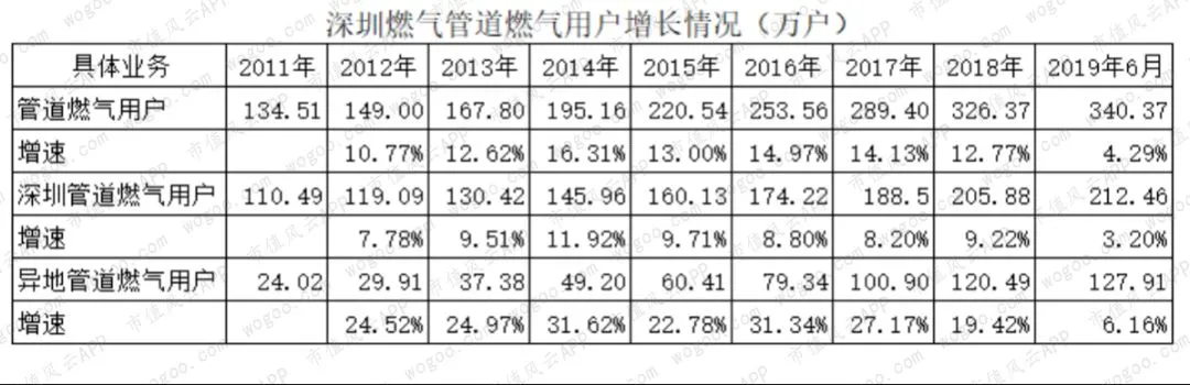 截至2019年上半年,在城市管道燃气业务上,已在广东、广西、江西、安徽、湖南、江苏、浙江、云南等8省(区)拥有40个城市(区)管道燃气特许经营权,管道燃气用户超过340万户,其中深圳地区212.46万户,深圳以外地区127.91万户。