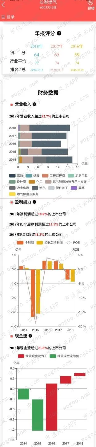 长春燃气2015年和2018年都出现亏损,也是6家公司中唯一出现亏损的: