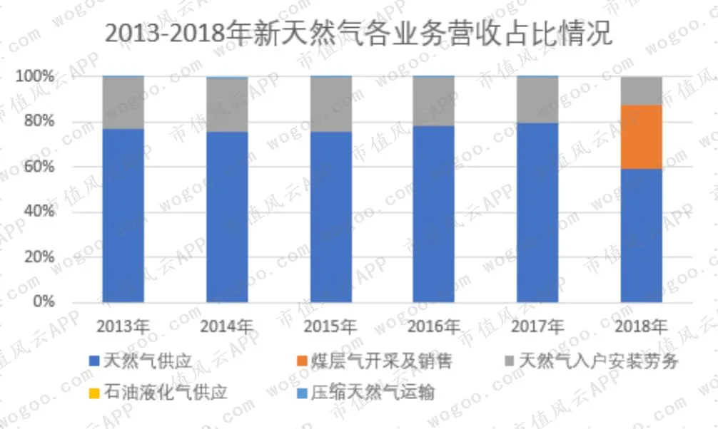 公司主要从事城市天然气输配与销售业务,涵盖城市民用、商用、车用和工业园区天然气等领域。其中,以天然气供应业务为主,对应毛利率为27%,2018新增煤层气开采及销售业务,占比28%,对应毛利率为72%,高居各类业务的毛利率榜首。