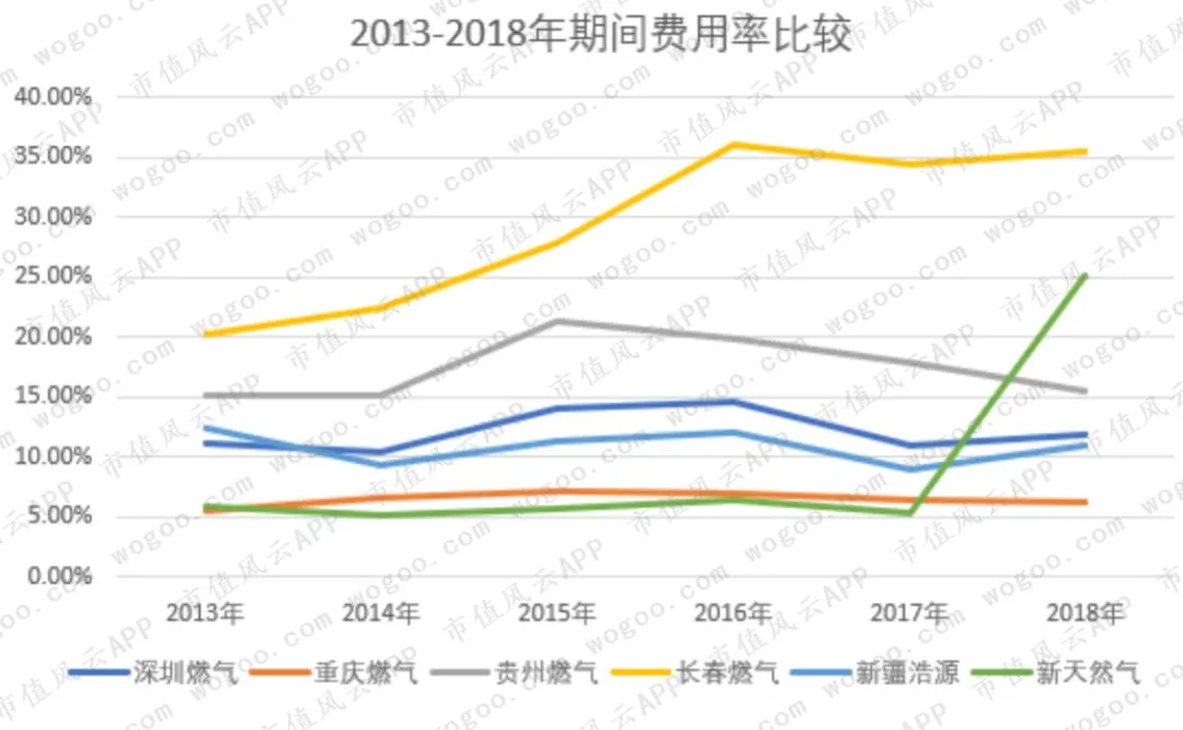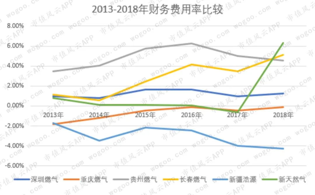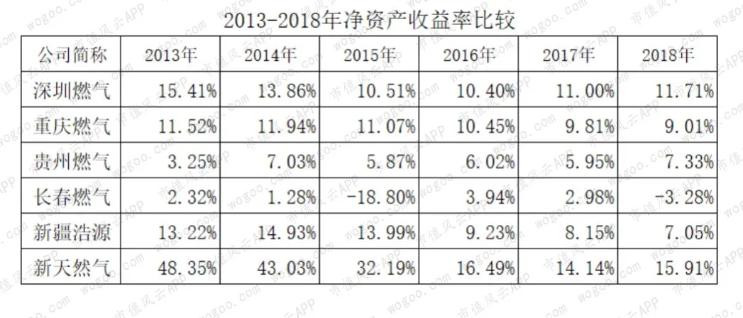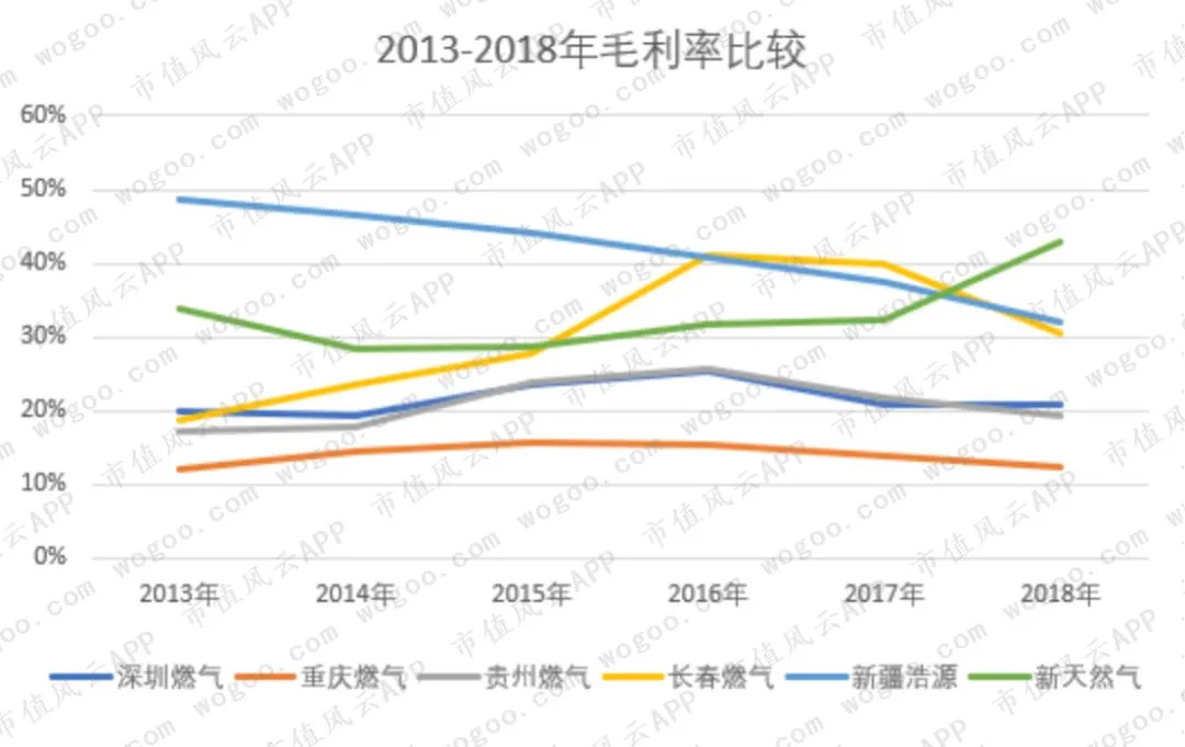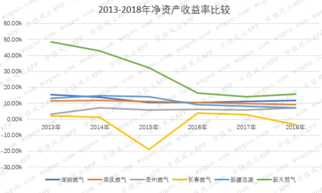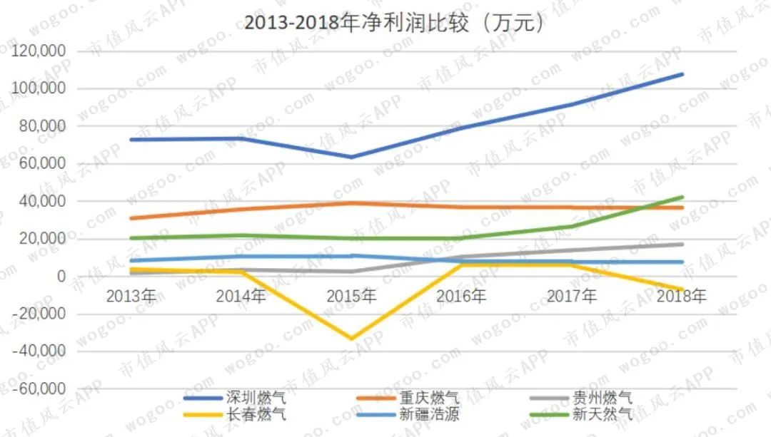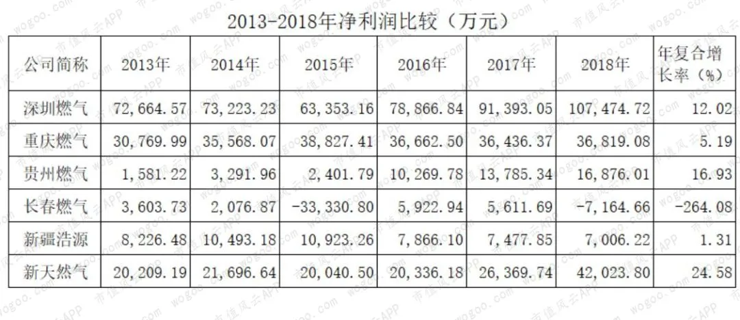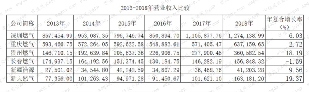 2013-2018年复合增长率,新天然气最高,达到19%,其次是贵州燃气的18%,新疆浩源接近10%,深圳燃气为6%,重庆燃气不到3%,而长春燃气的复合增长率为-1.59%。