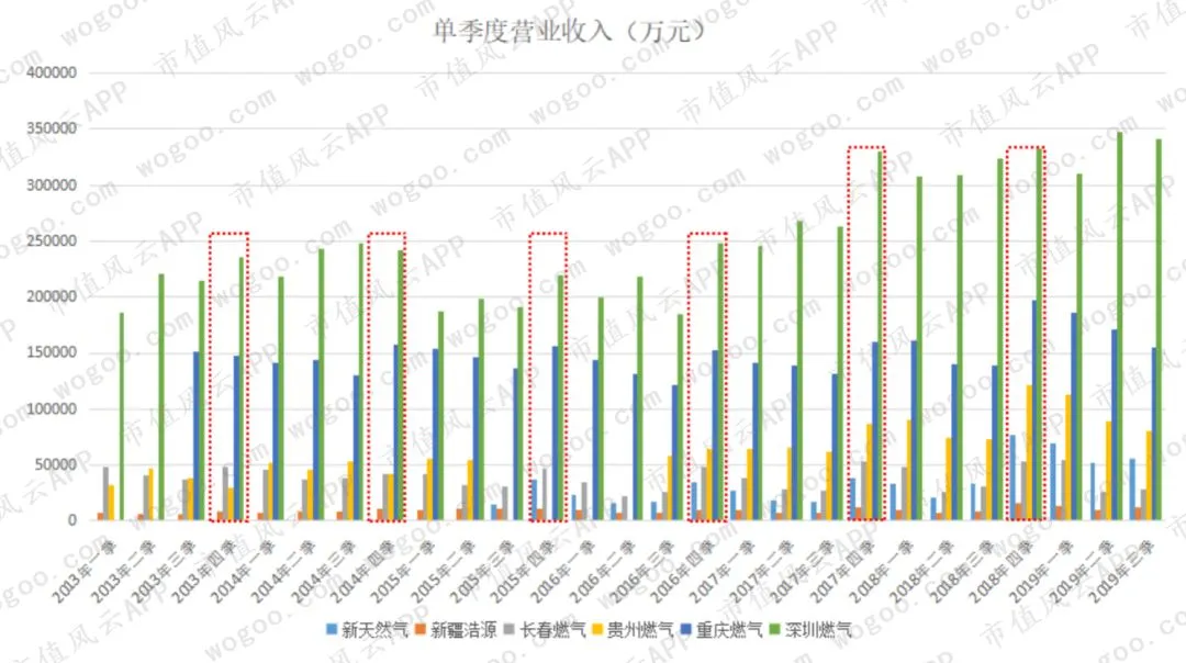 6家公司的单季度营业收入基本共性是,四季度营业收入高于前三个季度,与冬季需求旺季特征是相符的,其中,重庆燃气与长春燃气的这一特征非常明显。