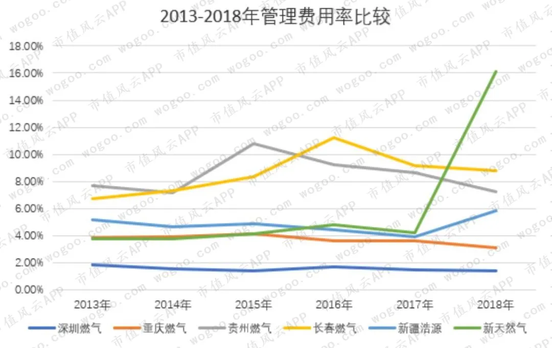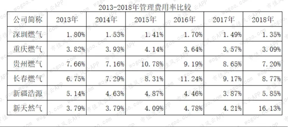 6家公司中的管理费用率分为3类,其一,长期低于2%的深圳燃气;其二,3%-5%之间的重庆燃气、新疆浩源以及新天然气(刨除2018年);其三,7%-10%之间的贵州燃气和长春燃气。
