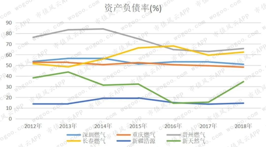 接上文,财务费用高的企业其资产负债率往往较高,贵州燃气因资本开支较大,资产负债率较高,长春燃气因历史遗留问题资产负债率也较高;深圳燃气和重庆燃气资产负债率稳定在50%左右;新疆浩源的资产负债率长期低于20%。