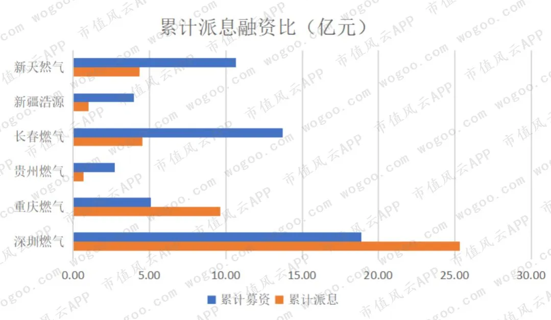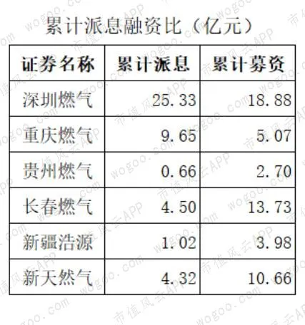 从派息融资比来看,截止2018年底深圳燃气的股东回报最高,累计派息25.33亿元,超过18.88亿元的累计募资;其次是重庆燃气,累计派息近10亿元,累计融资只有5亿元。
