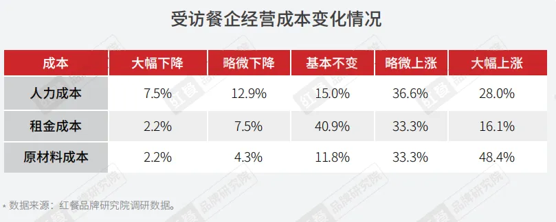 对于餐企目前面对的主要困难,本次调研设置了多项选择题,79.6%的受访企业认为其主要困难是营收减少,这也是占比最高的一个选项。餐饮业作为一个高度依赖现金流的行业,如果企业经营持续低迷,或将面临资金链断裂的危机,从而出现无法支付租金、员工工资、供应商货款等一系列的问题,继而波及餐饮产业的上下游链条。本次调研发现,约有68.5%的受访企业表示目前的账面资金仅能维持近3个月的经营。红餐品牌研究院调研了26家龙头餐企的营收数据后发现,部分龙头餐企2021年营收尚且可观。同时,有很多龙头餐企营收状况虽然营收增长,但营收增速远低于2019年的水平。另外,虽然部分餐企的营收在上涨,但盈利却大幅下滑,出现增收不增利的现象。海底捞、呷哺呷哺、海伦司均在2021年大幅亏损,相比去年同期由盈转亏,盈利能力与2019年相比存在很大的距离,短期内或难以恢复到疫情前的状态。调研显示,受访餐企2021年的成本相比2019年上升了17.1%;有超过6成的受访餐企认为目前的主要困难是门店租金、原材料成本和人力成本上升趋势。原材料成本、人力成本以及租金成本是餐企成本结构中增长最快的三项。本次调研发现,约有81.7%的受访餐企认为原材料成本对比疫情前上涨了,其中接近5成的受访餐企认为原材料成本大幅上涨。超过6成的受访餐企认为人力成本对比疫情前有不同程度的升高,超5成受访餐企认为租金呈上涨的趋势。(3)餐饮消费收紧,客流量下降