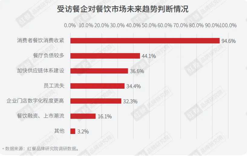 据国家统计局发布的消费者信心指数,进入2021年,指数伴随着此起彼伏的疫情态势再次逐步走低。尤其是2022年3月以来,消费者信心指数下降明显。由此可见,疫情之下,消费者对于消费的支出会变得相对谨慎,呈现出收紧消费的趋势。本次的调研数据同样印证了这一趋势,94.6%的受访餐企认为未来餐饮市场的消费会收紧。2.餐饮行业整体调整升级