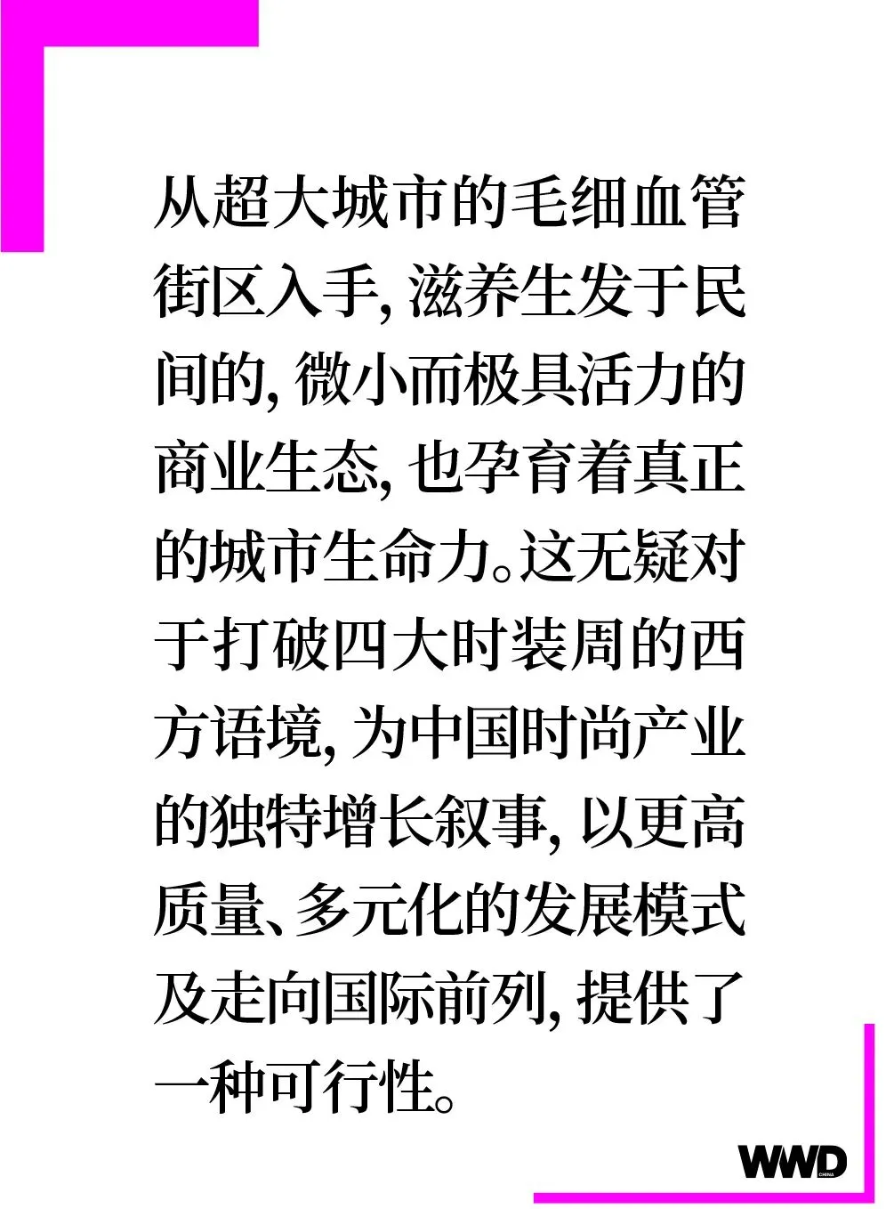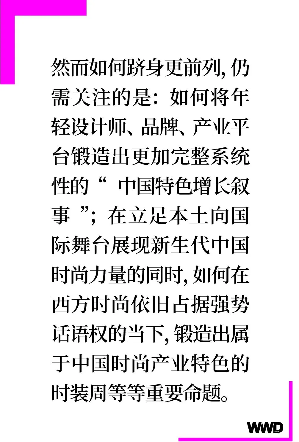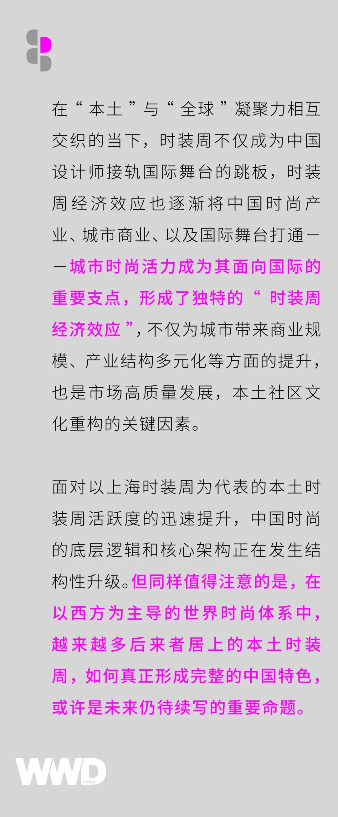 通过以上海时装周为例的城市名片,为中国时尚产业的增长叙事提供更具国际化的视野和平台,让中国本土设计力量在国际范围内形成更大回响。WWD