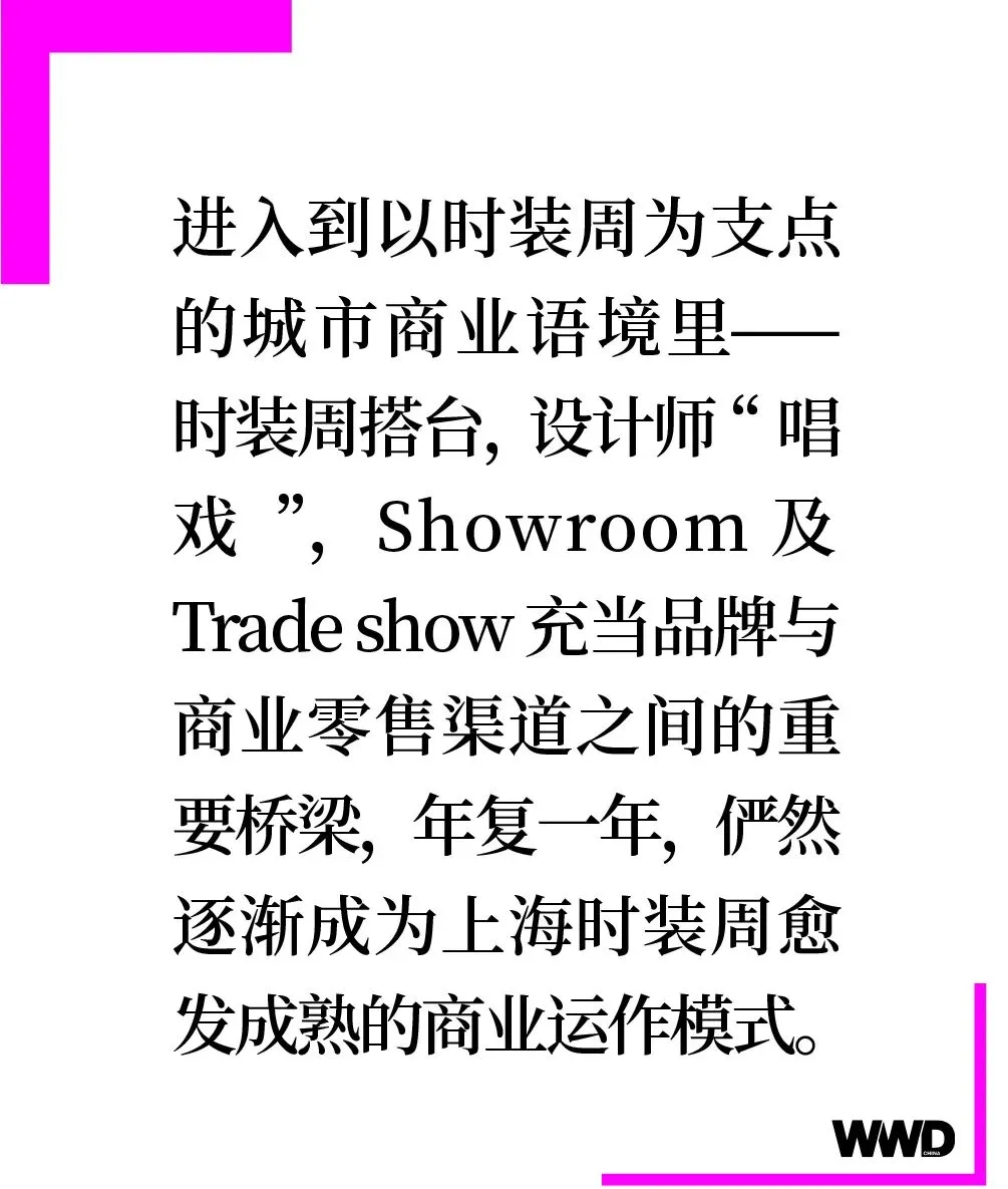 进入到以时装周为支点的城市商业语境里——时装周搭台,设计师“唱戏”,Showroom 及 Trade show 充当品牌与商业零售渠道之间的重要桥梁,年复一年,俨然逐渐成为上海时装周愈发成熟的商业运作模式。