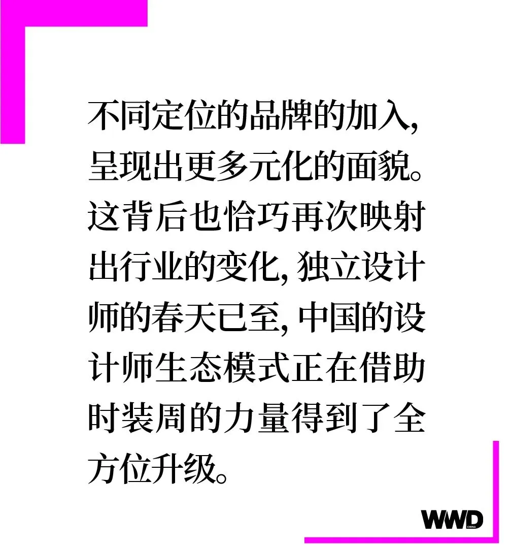 不同定位的品牌的加入,呈现出更多元化的面貌。这背后也恰巧再次映射出行业的变化,独立设计师的春天已至,中国的设计师生态模式正在借助时装周的力量得到了全方位升级。