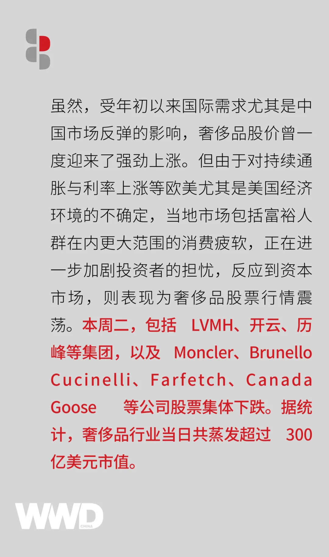 以传统经验来看,奢侈品曾一度是抗通胀利器。因此,过去很长时间,巨头林立的奢侈品市场所表现出的强劲韧性,曾使奢侈品股成为投资者眼中不确定时代的“确定性”。但现在,随着美国奢侈品市场的疲软一再加剧,投资者的信心不断被削弱,曾经的“确定性”正在面临前所未有的审视。此时,奢侈品股价只是短期震荡,还是未来经济的风向标?对于奢侈品牌的长期战略而言,是否会迎来市场重心或品牌策略的调整升级?其实,在多家奢侈品公司发布的第一季度财报中,不同地区不均衡的业绩表现就已经有所体现。例如,在 Burberry 截至 4 月 1 日的第四财季中,整体同店销售额实现 16% 增长的情况下,美国地区在该季度零售额下降了7%。Canada Goose 在第四财季全球总收入同比增长 31.4%的情况下,美国销售额降至 6750 万加元,而去年同期为 7070 万加元,该地区的业绩疲软当日对公司股价造成了下跌 2.14 美元、跌幅 10.5% 的影响。尽管历峰在美洲地区的销售额在 2023 财年按实际利率增长了 27%,按固定汇率计算增长了 14%,但董事长 Johann Rupert 表示,今年的增长将放缓,他还指出,美国联邦储备委员会在过去一年中如此迅速和频繁地加息是“鲁莽的”,在过去的 12 个月里,美联储以 40 年来最快的速度加息。此外 Johann Rupert 还说道:“美国经济真正的放缓可能从 11 月开始,这将影响到社会中的每个人,未来我们或许将面临更艰难的经济环境。”德意志银行分析师 Matt Garland在给客户的一份报告中指出,对于当前美国市场表不同群体的消费疲软表现出担忧,但他也认为,现在也正是品牌做出转变的时刻。尽管,通胀、加息,美国市场存在诸多不确定性,并且,这种不确定性必将影响到全球市场。但也有部分奢侈品股价截至目前并未受之影响。同时,在美国之外的全球其他市场的活力和韧性,正越来越多地被奢侈品看到。据德意志银行的 Matt Garland 分析,“整体业绩水平没有过度受到美国市场影响的奢侈品公司包括爱马仕、Moncler、LVMH 和历峰集团,他们在中国市场上依旧表现出强劲的需求,并与全球更多的年轻富裕消费者形成了共鸣。往往一些表现欠佳的品牌,比如 Ferragamo ,不仅受到品牌在创意和经营层面转型问题的困扰,也是由于将过多经历投入到了美国市场愈发疲软的消费群体身上。”摩根士丹利分析师 Edouard Aubin 则表示,尽管美国表现相对低迷,局部市场的信心已经被削弱。但总体而言,奢侈品行业具有弹性,美国经济的低迷在很大程度上被其他市场的强势所抵消。此外,面对当前市场和投资者的忧虑,规模持续庞大的奢侈品市场,股价及市场的波动,某种意义上或许也意味着一次“撇清泡沫”、寻找差异化的时刻。正如 Matt Garland 所表示,对于许多投资者来说,奢侈品行业现在很拥挤,且该行业对市场的溢价正处于历史高位。普华永道前不久预计,2023 年全球奢侈品市场规模将达到 3637 亿美元。随着旅游和社交活动逐渐步入正轨,全球奢侈品市场正稳步复苏,甚至超过疫情前的水平。2019 年,全球奢侈品市场规模为 2826 亿美元。另据 Banor SIM 股票主管 Angelo Media 透露,本周二奢侈品股票的下跌缺乏明确的催化剂,这可能代表着下跌十分短暂。