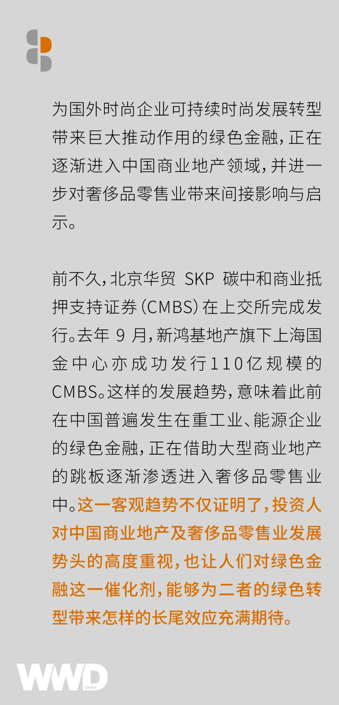 而 SKP 更是在 2021 年便获得认证,成为中国首家碳中和零售商场。从节能环保的基础建设、LEED 认证、强强两手的合作到整个商场运营实现碳中和的承诺,在新时代背景下,绿色转型成为了大型商业地产的共同发展目标,也成为了探索全新商业模式的起点。在这样的背景下,正在积极进发,从商业地产开始逐渐向时尚产业各个环节渗透的绿色金融,将会为奢侈品市场、以及不同规模与定位的中国时尚企业的可持续发展转型带来怎样的变化,让人期许。