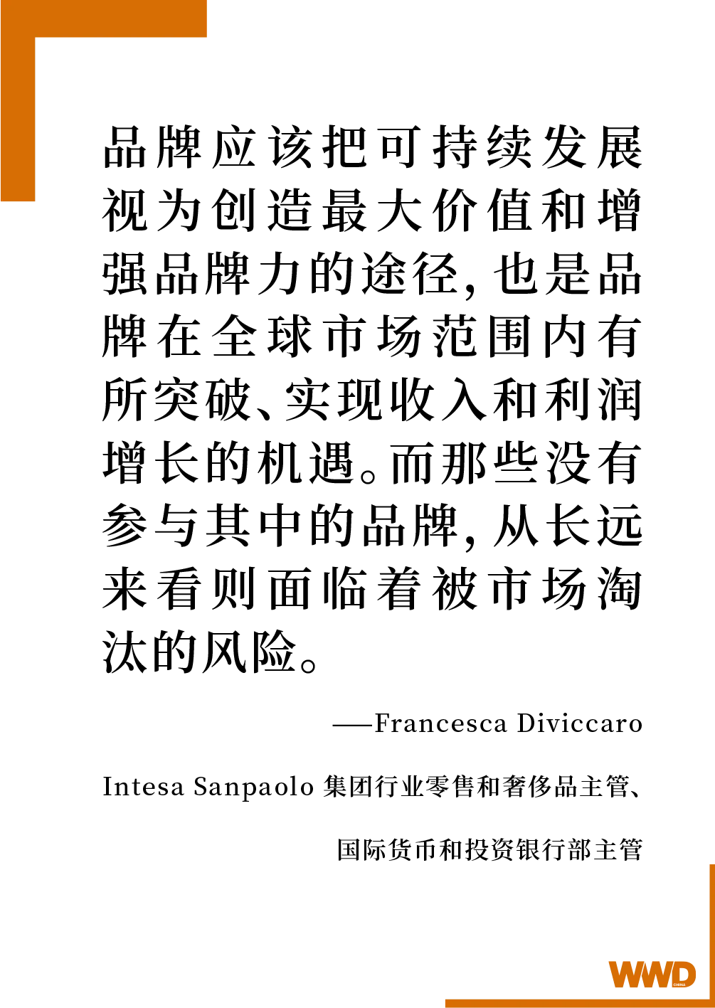 全球最大的资产管理公司 BlackRock 已将可持续发展作为其评估投资的新标准。该公司表示,可持续专项资金是投资方在管理风险、达到预期收益、建立投资组合和后续投资管理中不可或缺的一部分,对优化投资结果极为重要。因此,BlackRock 对被投企业设置了一系列详细的检查项目,就“将全球气候变暖控制在 2℃ 以下”以及“到 2050 年实现全球温室气体净零排放”等目标要求企业给出相应的商业计划。认证可持续企业的 Positive Luxury 的联合创始人兼首席执行官 Diana Verde Nieto 在接受 WWD 采访时表示,当下对投资者最有吸引力的就是那些在 ESG 目标上拥有野心和行动力的公司:“对投资者来说,有远大 ESG 目标的公司才是最具投资价值的公司。那些向投资者提供综合财务和 ESG 报告、加强中层管理人员参与 ESG 事务的企业才是未来的赢家。如果企业不严肃对待可持续发展问题,则将会成为投资界眼中的‘搁浅资产’。”意大利联合圣保罗银行(Intesa Sanpaolo)此前与 Gucci、Save the Duck 等品牌签订了相关绿色金融协议。当提到品牌应该对可持续发展持有怎样的态度时,集团行业零售和奢侈品主管、国际货币和投资银行部主管 Francesca Diviccaro 评价说:“品牌应该把可持续发展视为创造最大价值和增强品牌力的途径,也是品牌在全球市场范围内有所突破、实现收入和利润增长的机遇。而那些没有参与其中的品牌,从长远来看则面临着被市场淘汰的风险。”