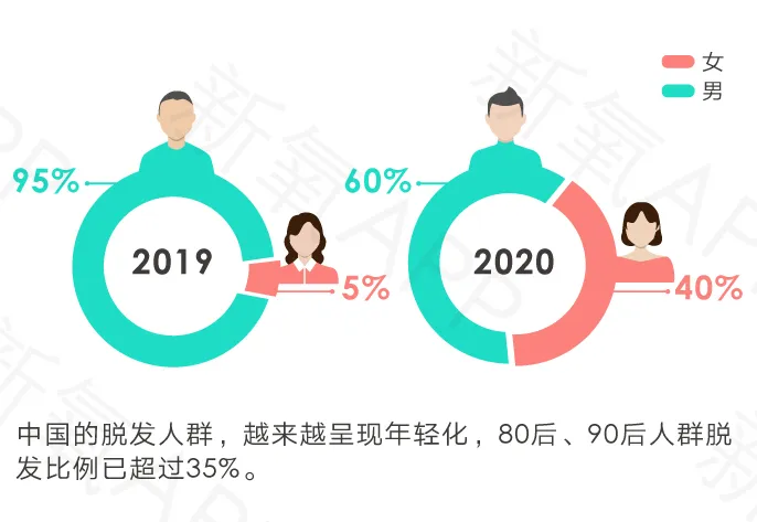 在“秃”这件事情上,人人平等。任凭你是明星、富豪、王室,普通人,男人还是女人。目前,我国脱发人群已超2.5亿 ,20岁~40岁男性是脱发主力军,30岁左右发展最快,比上一代人的脱发年龄提前了20年。但年轻女孩对掉头发的焦虑,一点都不比男性少。9月27日,新氧数据颜究院与每经智库·未来商业研究中心共同出品的《2020医美行业白皮书》(以下简称“《白皮书》”)正式发布,透视中国医美产业“线上化”新消费趋势。《白皮书》指出,在城市的工作压力下植发需求激增,过去服务的客群超过 95%为男性,以手术植发项目居多。而目前植发的女性用户占比已接近40%,主要集中在非手术项目植发。