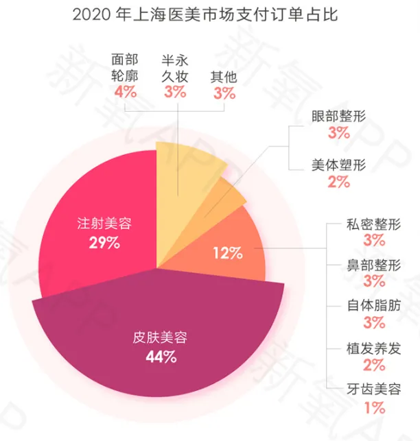 数据显示,中国的植发市场预计将在2020年底将超过200亿元,规模是四年前的四倍。随着消费升级和国人医美意识的提升,植发以及其他“头上生意”必将产生更大的市场空间,国内植发市场已处于医美行业爆发的临界点。《白皮书》指出,2019年-2020年的上海医美市场中,73%的订单来源于皮肤美容和注射美容,而植发养发则另外单独占据了2%的市场份额。