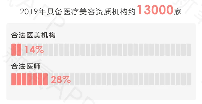 但目前的事实却是,三线城市下的低线市场,正规医美服务供需不均 ,2019年中国具备医疗美容资质的机构约13000家,合法医美机构仅占行业14%,合法合规医美机构仅占行业12%,合法医师仅占行业28%。