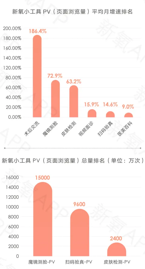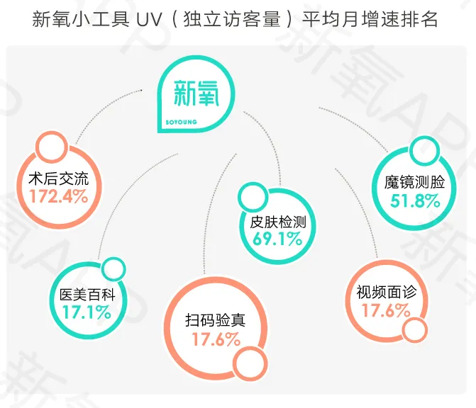 《白皮书》介绍,新氧模式成为医美行业线上获客方式的一大创新,以“美丽日记”为代表的新氧内容生态的正向循环,使平台成为一个线上线下具有竞争力的生态系统,对影响购买决策,提升复购率形成强有力的帮助。但新氧科技“揽新”的主要抓手除了内容生态外,还有视频面诊、魔镜测脸、皮肤检测等实用的小工具。数据显示,截至2020年6月30日,小工具累计使用量超过5.1亿次,其中“魔镜测脸”小工具累计使用已超1亿5000万次、“扫码验真”小工具累计使用量也已接近1亿次、“皮肤检测”累计使用量也已接近2500万次。