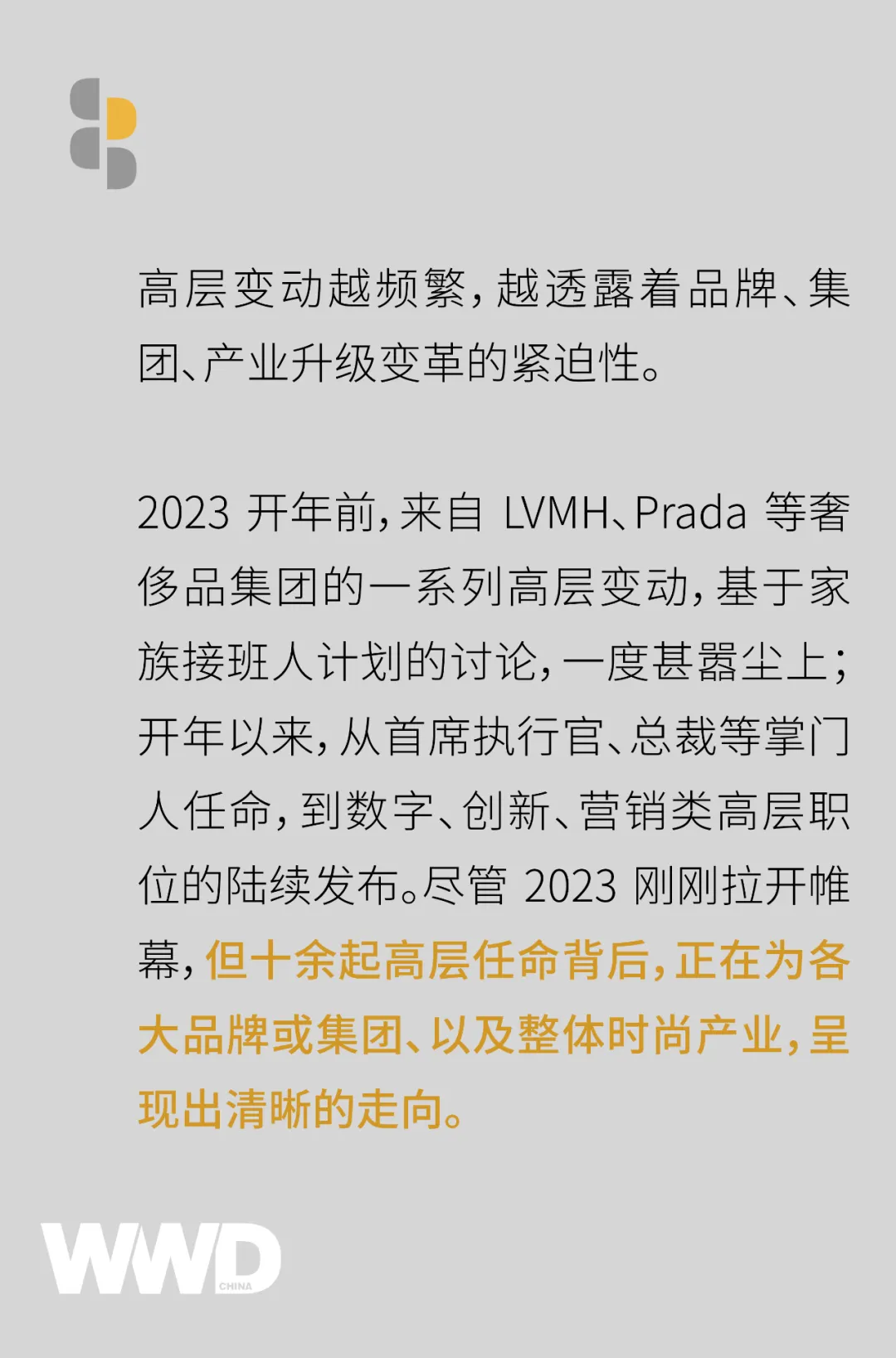 通过对 2023 开年以来、全球时尚产业十余起高层任命的观察不难发现,不论是相对成熟的奢侈品牌或集团、较为年轻新锐的设计师品牌,面对全新产业环境,通过 CEO、总裁等全新掌门人任命,首要着眼的,便是沉寂后的全球化扩张,以及在充满不确定的经济环境下、尤为根本的业绩增长。