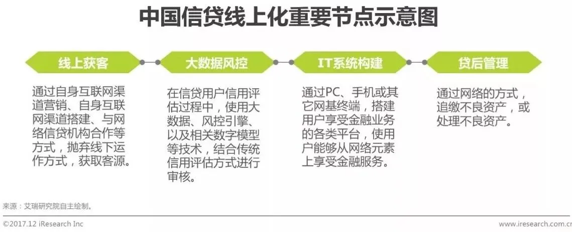 信贷业务的全流程存在四个重要的节点,这四个节点有任何一个节点涉及线上,从更加宏观的视角审视,都应该涵盖在中国整体信贷线上化的蓝图中。