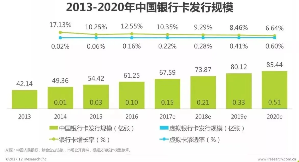 如果按技术元素划分产品,那么理论上银行卡应该是最早的移动终端。所以从这个思路出发,银行卡面临的是各类移动终端,更加宽松的监管条件,更丰富的表现形式,更强大的实用功能三者的共同挑战。所以现在虽然无现金社会的构建,能够对手机账户与银行卡进行双向促进,但是长久来看,银行卡被替代将成为必然趋势。所以一方面,银行未来会面临实体卡向虚拟卡的转移,另一方面与账户体系完备完善的互联网公司合作,将最快的帮助银行完成获客。