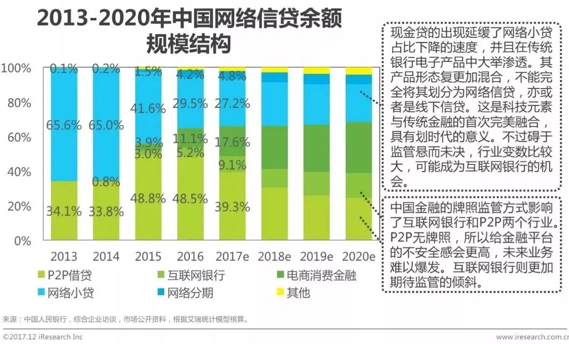 2017年,P2P借贷余额依旧占据最大比重。因为现金贷的出现使网络小贷这一品类占比下降的速度大幅延缓。在花呗、白条等互联网产品的壮大下,电商消费金融在网贷行业中的地位进一步提升。而且,在趣店等当初明确打出消费分期的企业上市并宣布转型电商之后,网络分期这一品类有可能失去分类价值,在运营模式上与电商消费金融极其类似,统计上有可能合并。在未来银行牌照没有因为监管而独揽大权之前,互联网银行可能会收到压制,但其丰富的想象空间,让我们依然看好。