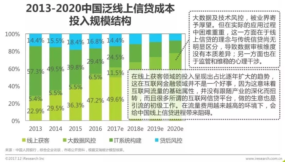 按照“获客、风控、系统、贷后”四个结构拆分,中国泛线上信贷成本支出的结构如下。2013年甚至于更早的时候,线上信贷几乎不存在,所以那个时候绝大部分的投入,都集中在从零开始搭建的系统上。但是随着时间的推移以及技术能力超强的延展性,使得系统开支逐渐向系统升级方向转变。投入占比相应减小。取而代之的是更加核心的风控,和互联网基础属性——流入层面的投入。