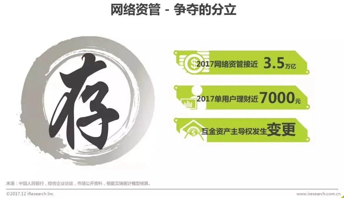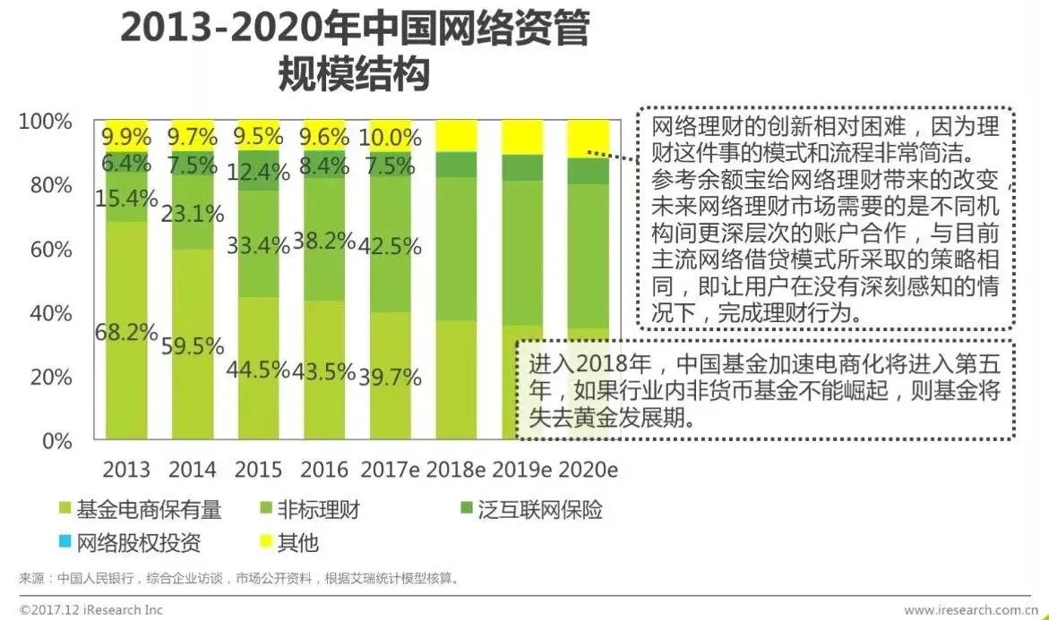 2016年和2017两年间,网络理财的发展依旧如火如荼,尤其2017年,银行间市场的利率走高,导致余额理财类产品的市场热度进一步提升,标志性的产品余额宝规模创历史新高,惊艳全球。不过整体上看,网络理财用户的人口红利消耗殆尽,症结在于余额理财模式之后,网络理财再无有影响力的创新模式出现,导致用户增速放缓,行业增长节奏与证券行业“靠天吃饭”的模式趋同。