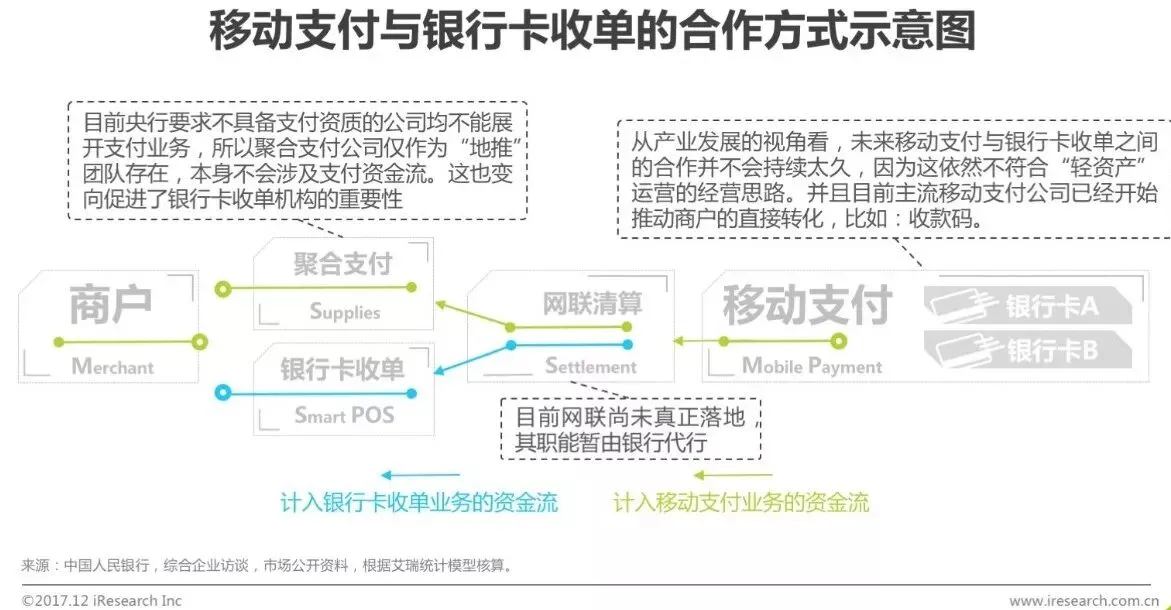 在整条线下支付的商业版图中,银行卡收单是在移动互联网新趋势下,发挥独特历史作用的“古老贵族”。近年来,互联网商业领袖及互联网巨头的战略,都不约而同的集中在线下实体经济。但实际上线下商业环境非常复杂,擅长轻资产运营的互联网公司,在进军线下的过程中并没有想象中那么顺利。比如:线下团队管理、绩效、监督、营销和服务等,每一项都和线上有区别。而互联网公司的不足,却是银行卡收单机构的优势,这也造就了中国移动支付线下支付独特的图景,移动支付公司通过两条渠道完成业务,一条是利用自身资源,联合聚合支付公司帮助商户直接转化;另一条是与银行卡收单机构合作。而当银行卡收单机构的智能POS协助完成了移动支付业务后,这笔业务产生的交易规模既计入移动支付,又计入银行卡收单。
