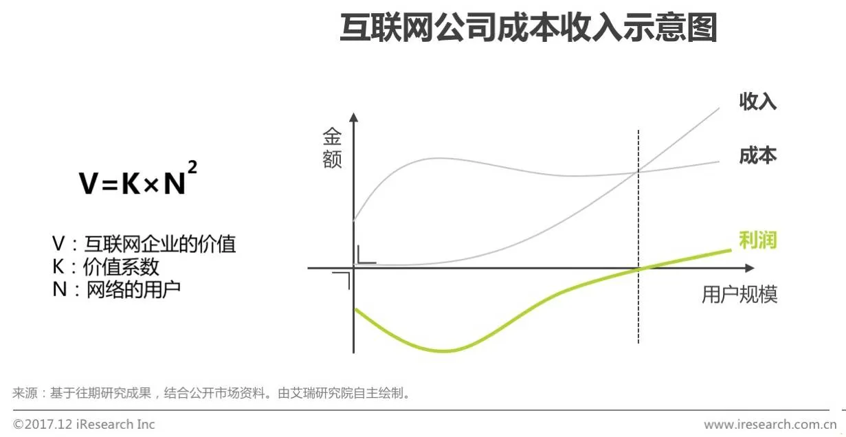 梅特卡夫定律(Metcalfe‘s Law)的核心内容是:在有n个成员的通信网络中,每个成员可以与其他成员建立n-1个关系。所以梅特卡夫认为网络的价值等于网络节点数的平方,网络的价值与联网的用户数的平方成正比。所以基于梅特卡夫定律,也证明互联网企业的价值与用户之间的正相关关系。但是艾瑞分析认为,梅特卡夫定律所衡量的是同一性质下网络的价值,而目前互联网企业业务线都比较丰富,所以在将梅特卡夫定律作为互联网企业估值原理时,需要按照不同业务线拆分企业,并将所有业务分别估值,然后汇总所有业务线上的用户价值,即可按照互联网的商业逻辑评估互联网公司的价值。