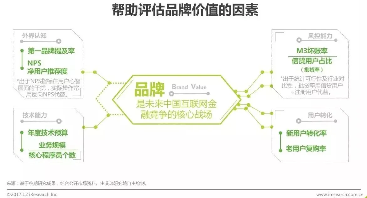 尽管增速放缓,但即便未来保持平均每年40%左右的信贷余额增速,在互联网各行业中也属于高速成长的行业。因此,未来互联网环境将继续承担“资产工厂”的角色,高速高效的生成新资产。而在这一过程中,坐拥资金的金融机构如何进行筛选将变成核心课题。在没有合作风控,或者资本关系的前提下,平台的品牌积淀将成为资金端选择优质资产的重要考量指标。艾瑞认为,以下三点将成为评价互联网信贷机构品牌实力的指标:第一:成立时间,越长越好。第二,平台转化率,高于同业机构,越高越好。第三,复购率,复购率指用户再次借贷行为。在没有深入合作的基础上,考量以上三个指标,能最大限度的帮助企业鉴别资产质量。