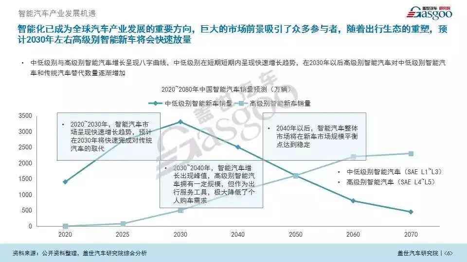 智能化已成为全球汽车产业发展的重要方向,巨大的市场前景吸引了众多参与者,随着出行生态的重塑,预计2030年左右高级别智能新车将会快速放量。