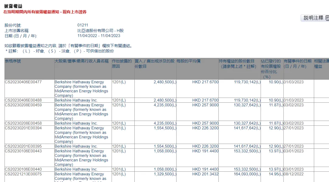 减持322.55万股比亚迪H股,均价195.4212港元/股