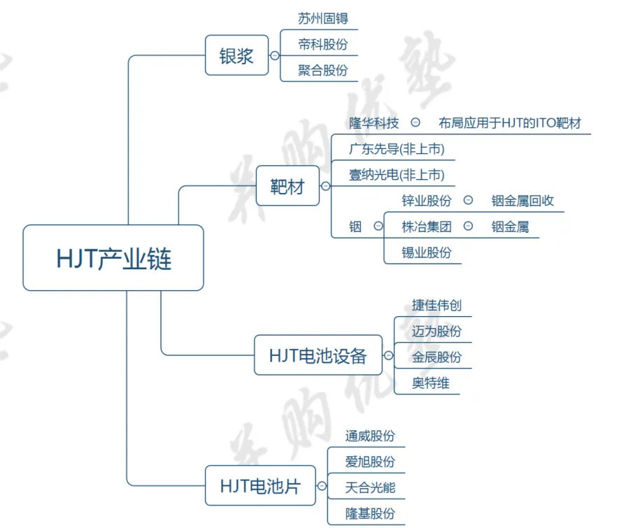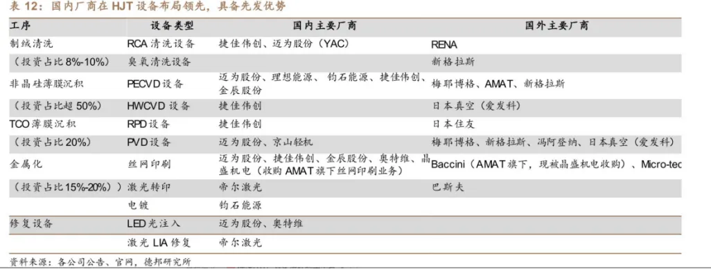 光伏行业,一代技术、一代工艺、一代设备,其中的设备,是每一代新技术的核心瓶颈环节。光伏产业发展的核心驱动力,是度电成本不断下行,带动投资收益率的不断提升,而降本增效是产业发展的恒久追求。如今,尽管行业非常内卷,但在PERC转换效率和降本空间逼近极限的当下,具有更高转换效率的新型电池技术正在迎来发展窗口期,TOPCon、HJT、IBC/HBC、钙钛矿等新一代电池技术,仍然具备较大的发展前景。起始阶段(1974~1996年):1974年Walter Fuhs提出将非晶硅与晶硅结合的HJT结构,1983年异质结电池正式面世,但转换效率仅为12.3%,1991~1996年日本三洋将本征非晶硅引入异质结电池结构,转换效率大幅提升,并为此申请了专利。初步发展阶段(1997~2009年):1997年,三洋开始生产HJT光伏组件。此外,德国设备公司Roth&Rau(后被梅耶博格收购)以及法国国家太阳能研究所(CEA/INES)也投入HJT电池的研发。工艺生产阶段(2010~2017年):随着2010年松下(收购三洋)的HJT专利保护结束,HJT迎来了快速发展时期,转换效率节节攀升。2017年,日本Kaneka以背接触技术与HJT结合,实现了26.6%的电池转换效率世界纪录。商业化和国产崛起阶段(2017年至今):随着量产工艺初步成熟,各国厂商开始投资HJT产线,由中试线到100MW规模量产线,再到通威、爱康等厂商宣布GW级量产线计划。国产电池厂商和电池片设备厂商通过吸收国外先进技术与自主研发,在HJT电池领域也取得一定优势。[1]HJT电池成本中设备折旧占比较高,2018年底,海外企业的全进口设备,单GW投资金额达到8-10亿元,是PERC电池的3倍左右。设备国产化是HJT电池降本增效的重要环节。上游——以丝网印刷生产线成套设备为例,上游主要是钢材、铝材、机械零部件和电气元件等,包括伺服电机、驱动器、PLC控制器、工控机等供应商,各种原材料供应充足。代表公司有汇川技术等。中游——电池片设备厂商,代表公司有捷佳伟创、迈为股份、金辰股份、理想万里晖、钧石能源,以及海外的Rena、YAC、AMAT、梅耶博格等。