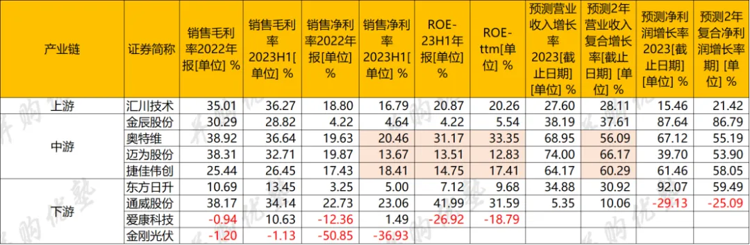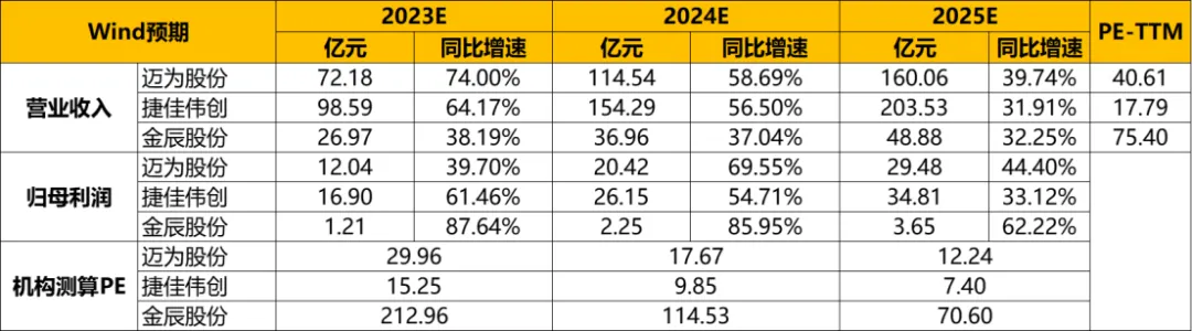 迈为股份——2023年前三季度,实现营收51.07亿元,同比+69.35%,归母净利润7.14亿元,同比+3.88%,扣非归母利润6.62亿元,同比+4.26%。捷佳伟创——2023年前三季度,实现营收64.05亿元,同比+50.48%,归母净利润12.23亿元,同比+48.96%,扣非归母利润11.30亿元,同比+48.16%。金辰股份——2023年前三季度,营收17.3亿元,同比增长19%;归母净利润0.75亿元,同比增长36%。图:Wind机构一致预期增长和景气度情况